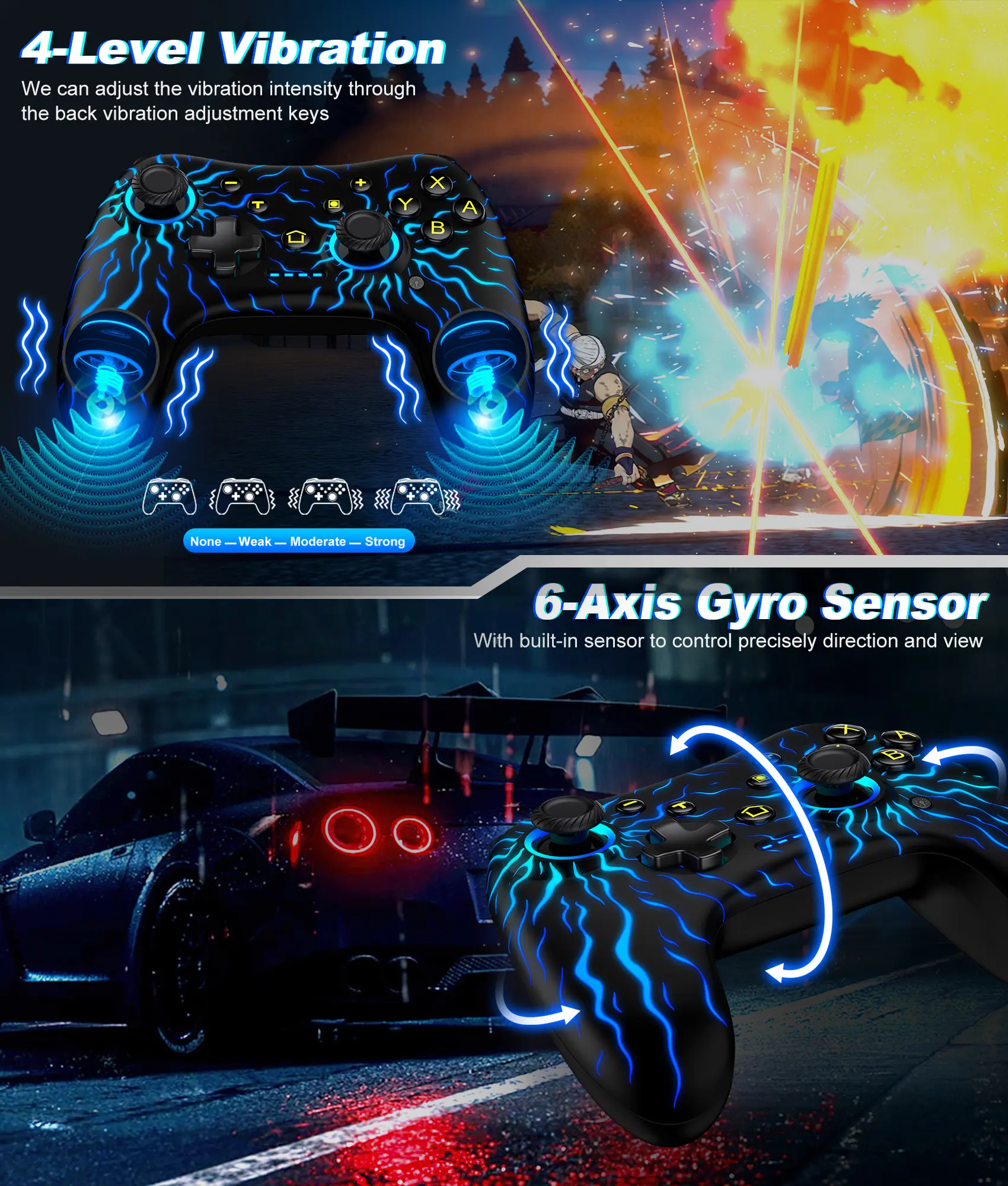 Equipped with dual vibration motors, this controller allows you to adjust the vibration intensity to No, Weak, Medium, or Strong. This customization enhances your gaming experience by providing precise vibration feedback. The smooth joystick and responsive buttons further enhance your gameplay.