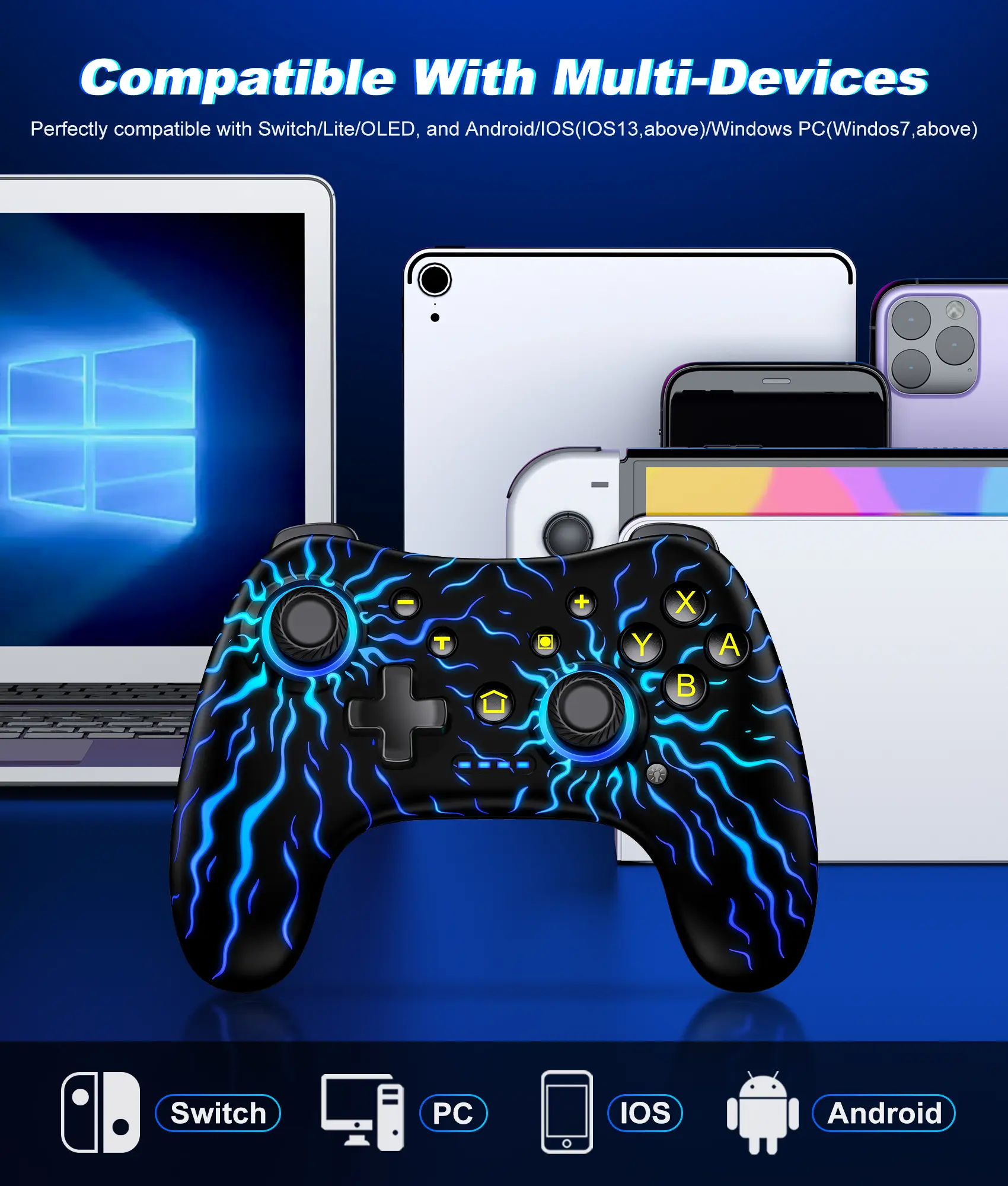 This switch controller is compatible with Nintendo Switch, Switch Lite, Switch OLED, Android (HID Mode), iOS (MFI Mode), and can be wired to PC (Windows 7/8/10). It features a one-button wake-up function: after the initial connection, pressing the "HOME" button will wake up the console and automatically reconnect.