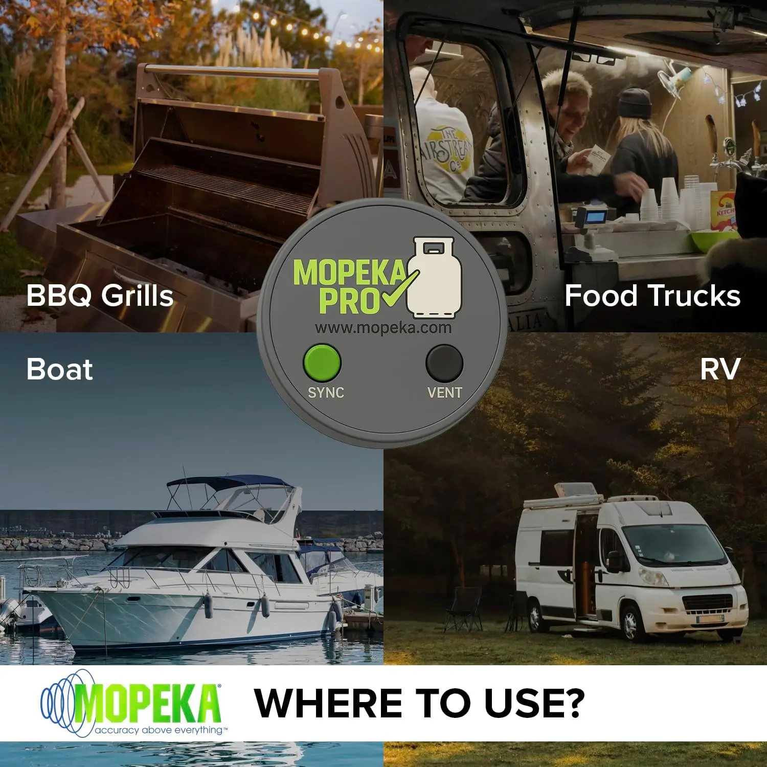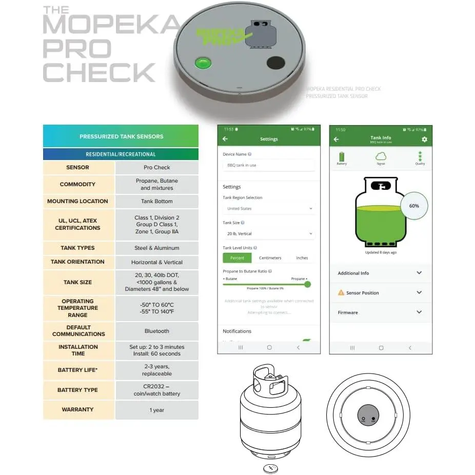 WIRELESS PROPANE GAUGE - This digital propane tank gauge is an essential tool for anyone who enjoys outdoor cooking or using propane-powered patio heaters. The Mopeka tank sensor connects to your phone through a mobile app, providing you with real-time updates on the propane level.EASY TO INSTALL - Our propane tank gauge effortlessly attaches to the underside of your propane tank through powerful magnets. It can be secured in place to the tank level in seconds with enhanced ultrasonic capabilities. Even when traveling on uneven terrain, the sturdy magnets prevent our monitor sensor from detaching from your RV's propane tanks. This gas gauge for propane tank is designed to accommodate most standard and custom LPG tanks from 20lbs up to 120 gallon or 420 lbs.IMPROVED BATTERY - This propane tank fuel gauge is convenient for monitoring your propane levels without physically checking the tank. With the latest improvements in battery technology, propane tank gauge level indicator now has a longer-lasting battery, ensuring it remains operational for extended periods without needing to be recharged or replaced.LATEST MODEL - Mopeka's latest patented ultrasonic sensor, the Pro Check, boasts enhanced reading quality and precision. This propane grill gauge features an integrated temperature sensor, tank "bubble level," configurable sample timing, firmware updates, alarms/alerts, and more. It supports both vertical and horizontal cylinders, making it a versatile option for propane tank monitoring.FREE MOBILE APP - The Mopeka "Tank Check" app is free for download on Apple and Google Play stores. It allows unlimited tanks and sensors with customizable alarms. You can access the propane tank gauge app remotely using the Mopeka Wifi Bridge or monitor your tanks without a phone using the Mopeka Monitor (available for purchase separately).