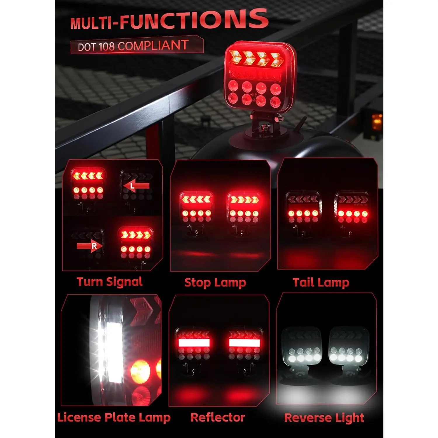 ·FMVSS 108 certified with six functions: tail lamp, brake lamp, turn signal lamp, backup lamp, license plate lamp, and reflex reflector.