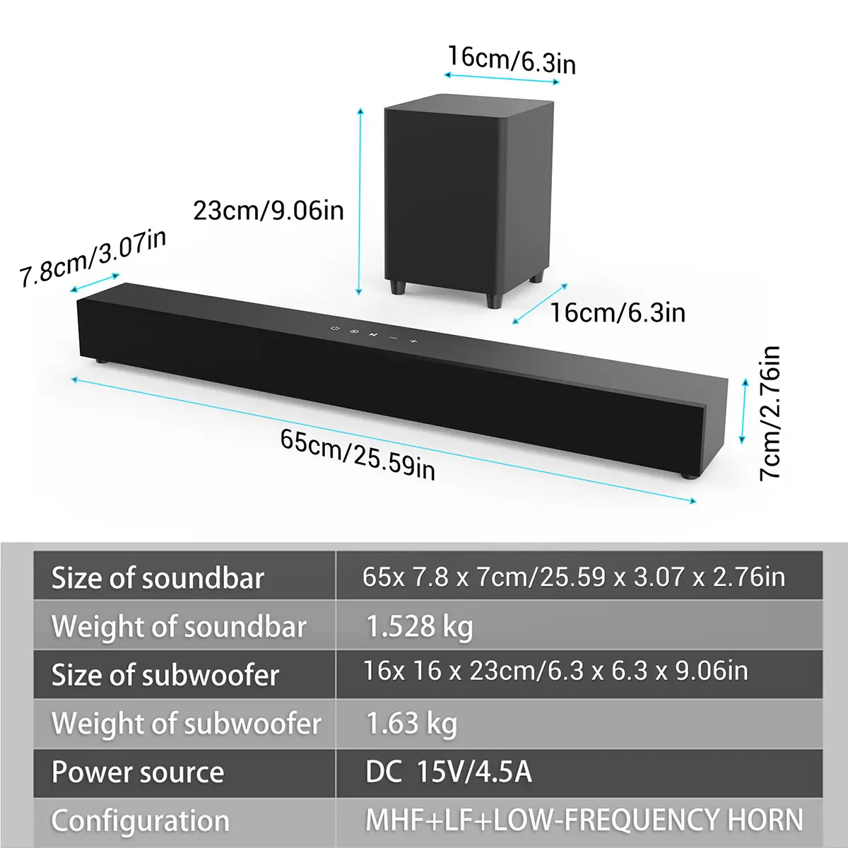 Total power: 60W (main unit with 2 speakers at 15W each, subwoofer at 30W)