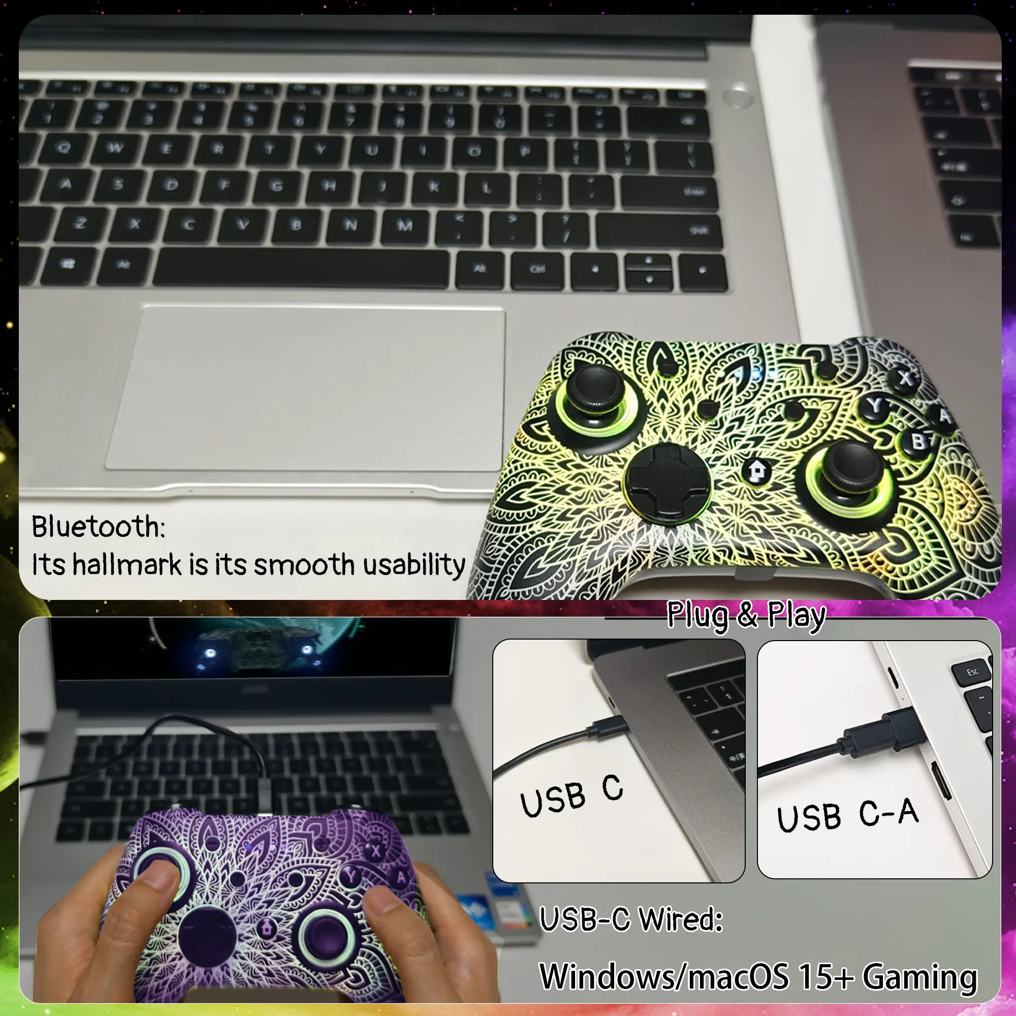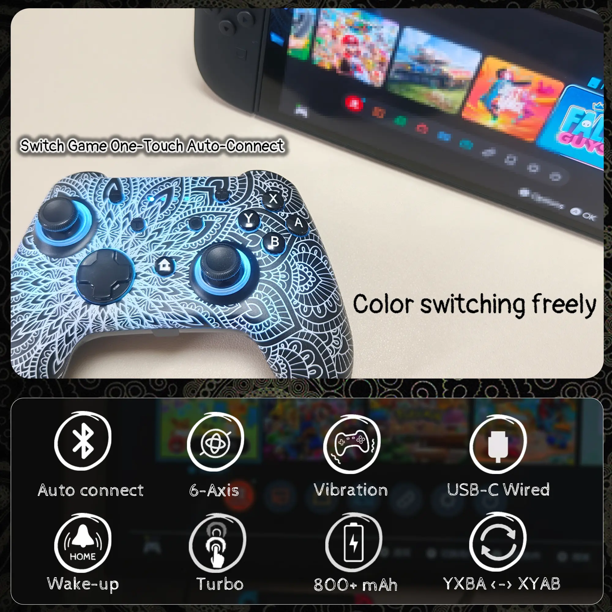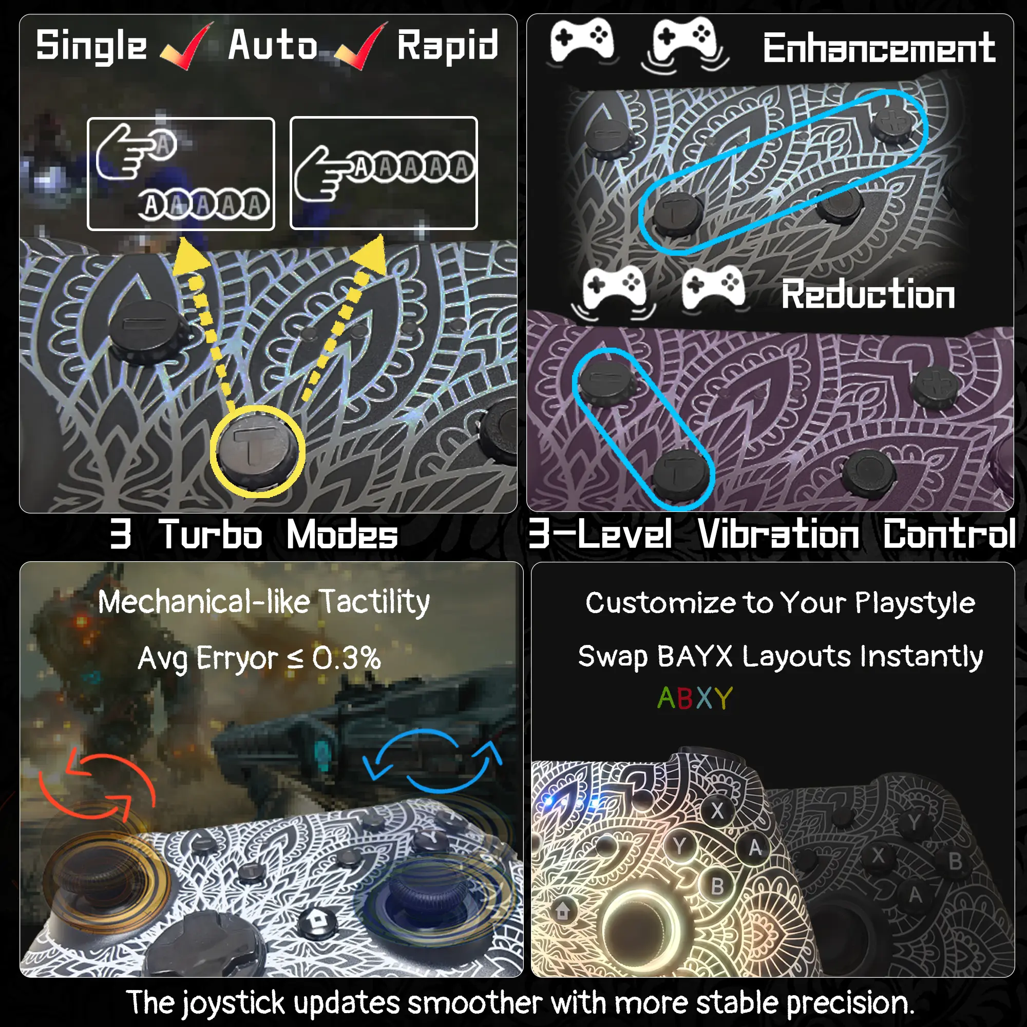 ·Pro-Grade Gaming Controls - Features Bluetooth 5.0 for lag-free connection, dual precision vibration motors with 3 adjustable levels, high-sensitivity 6-axis gyroscope, customizable Turbo rapid-fire, programmable M1/M2 back buttons, and instant one-touch reconnect/wake-up for seamless gameplay. Experience precision control with joysticks rated at ≤0.3% error, and the ability to swap YXBA/XYAB button functions in any connection mode.