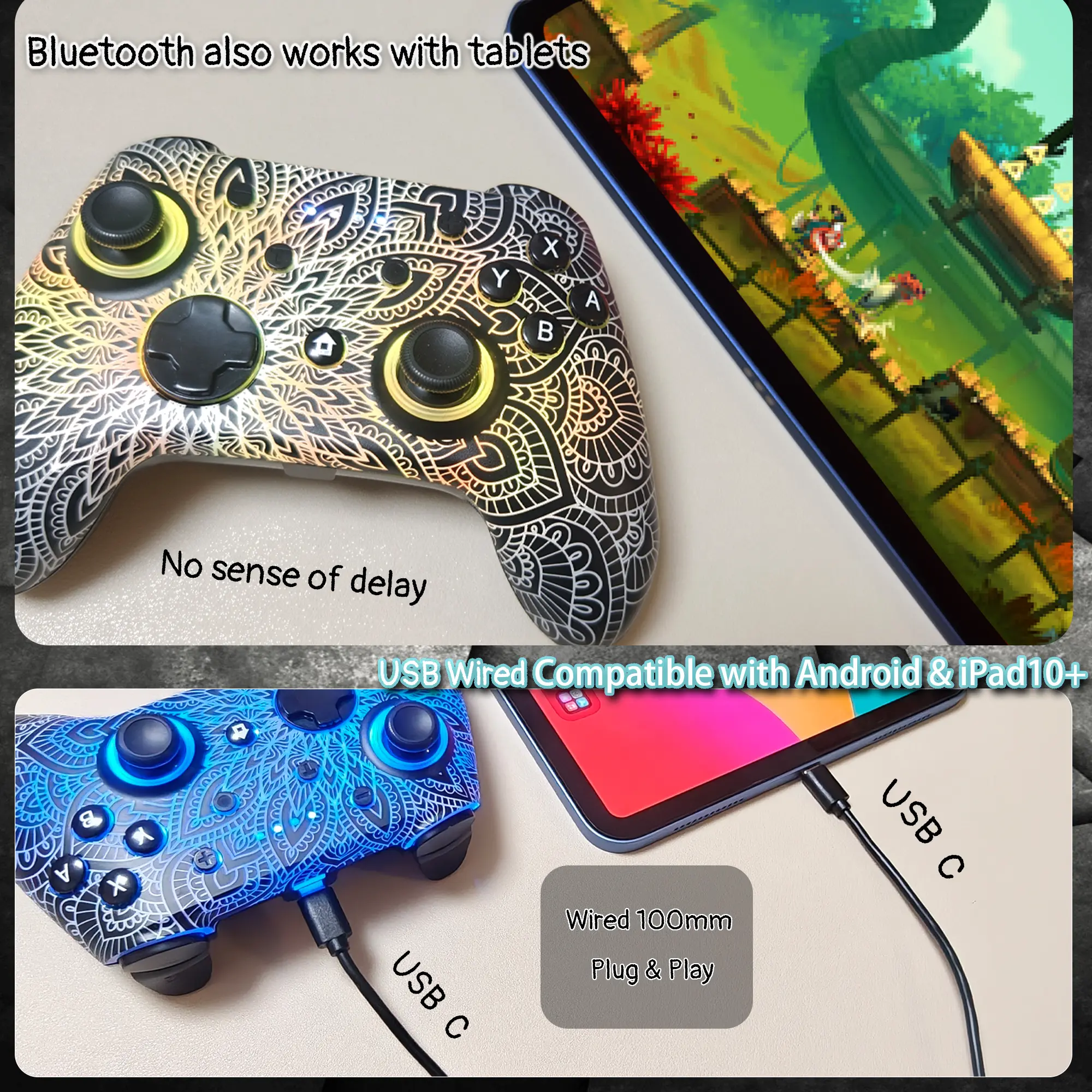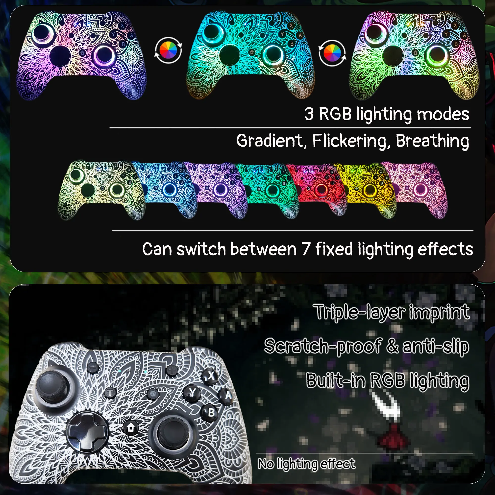 ·We've implemented regular upgrades to our gaming controller, and this latest version now features dynamic RGB lighting effects. While the daytime appearance matches the product images, the lights transform into an even cooler spectacle at night. Powered by an optimized 800mAh+ battery delivering 10-15 hours of gameplay. Allowing you to dominate each battle with more personality and become the center of attention.