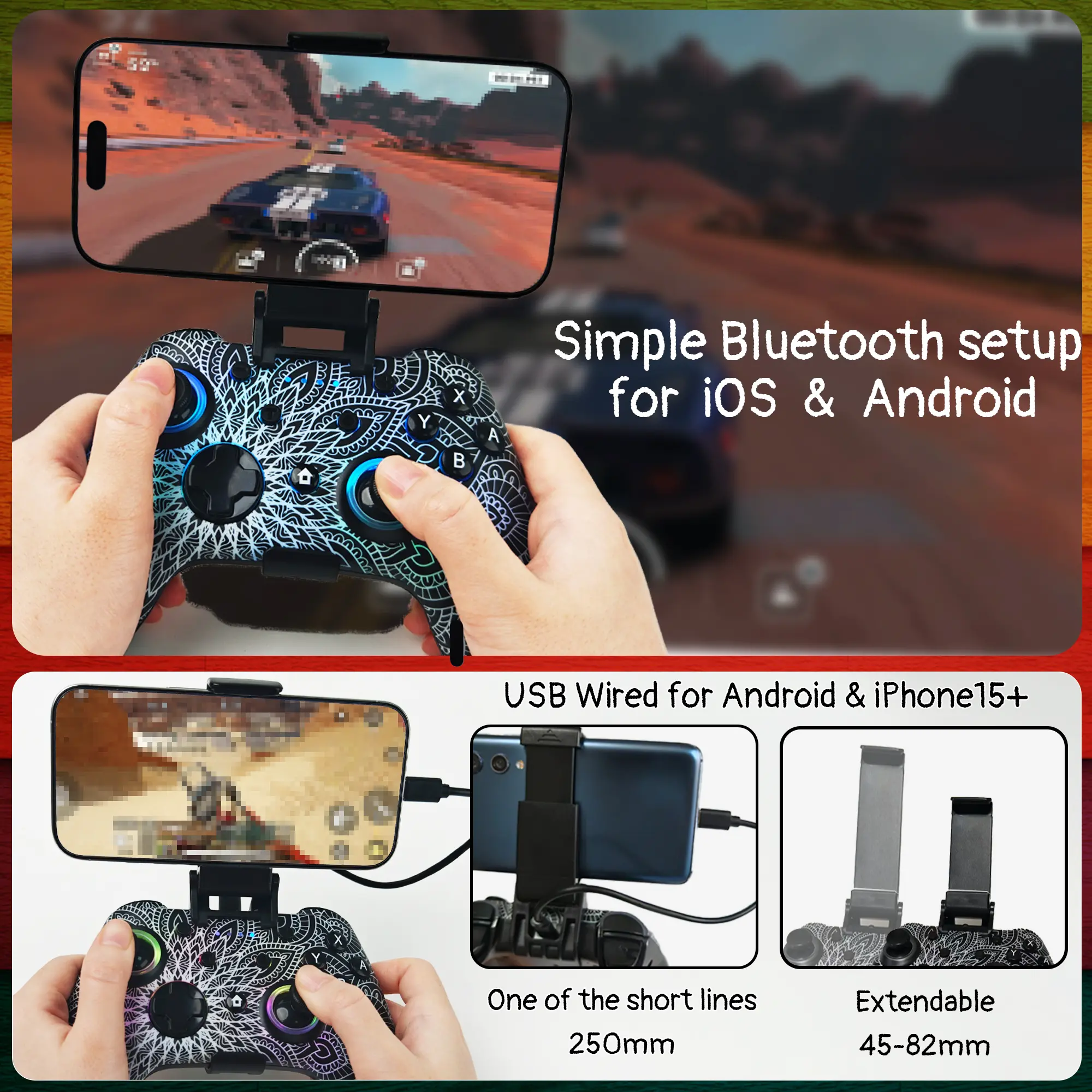 ·Wired Controller Mode - For games compatible with wired controllers, the included accessories are highly practical. The package comes with a 25cm USB-C to USB-C cable (with a phone holder), which is instantly recognized by iPhone 15/16 and Android devices like Samsung and Motorola (more convenient than Bluetooth).