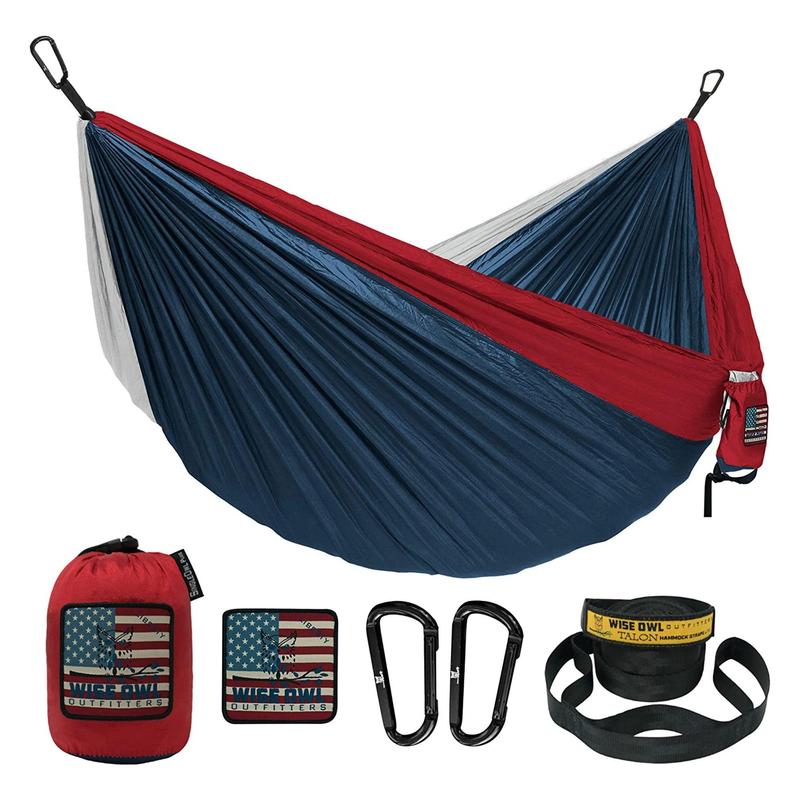 Grab a pal to hang out with and take in the outdoors using the Wise Owl Outfitters DoubleOwl Hammock.Comfortably seating 2 people, this tree hammock allows you to relax, sleep, and sway supporting up to 500 pounds. The strong yet soft nylon hammock measures 10 feet long and 6 feet wide, great for cozying up with a partner. Unpack and set up easily in just about a minute, then pack up when you're done using the attached storage bag. You can even use the storage bag as a pocket when the hammock is set up! If your 2-person hammock gets dirty, simply toss it in the washing machine for easy maintenance. This outdoor hammock includes 2 talon straps with loops and 2 carabiners for height adjustability and customization.There's no need to sleep on the ground while you're camping. Grab the Wise Owl Outfitters Large DoubleOwl Hammock so you can sleep among the stars and above the ground.