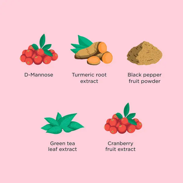 Ingredients: Vitamin D (as cholecalciferol) 20 mcg (800 IU), D-mannose 300 mg, Cranberry fruit extract 100 mg, Green tea leaf extract (98% Polyphenols) 100 mg, Turmeric root extract (95% Curcuminoids) 100 mg, Black pepper fruit powder 5 mg