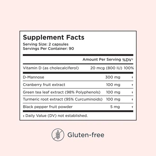 ยทIngredients: Vitamin D (as cholecalciferol) 20 mcg (800 IU), D-mannose 300 mg, Cranberry fruit extract 100 mg, Green tea leaf extract (98% Polyphenols) 100 mg, Turmeric root extract (95% Curcuminoids) 100 mg, Black pepper fruit powder 5 mg