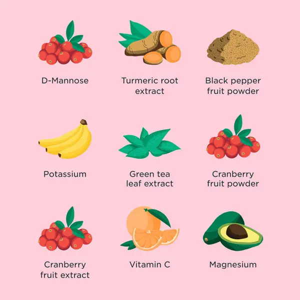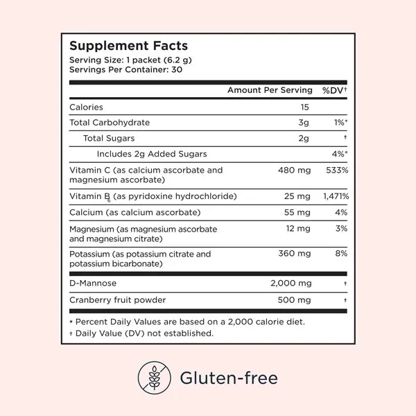 ยทIngredients: D-Mannose 2000 mg, Cranberry fruit powder 500 mg, Vitamin C (as calcium ascorbate and magnesium ascorbate) 480 mg, Vitamin B6 (as pyridoxine hydrochloride) 25 mg, Calcium (as calcium ascorbate) 55 mg, Magnesium (as magnesium ascorbate and magnesium citrate) 12 mg, Potassium (as potassium citrate and potassium bicarbonate) 360 mg