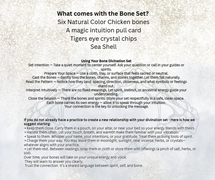Perfect for both beginners and experienced bone casters. This set is ideal for those seeking divination, communication, and spirit connection.