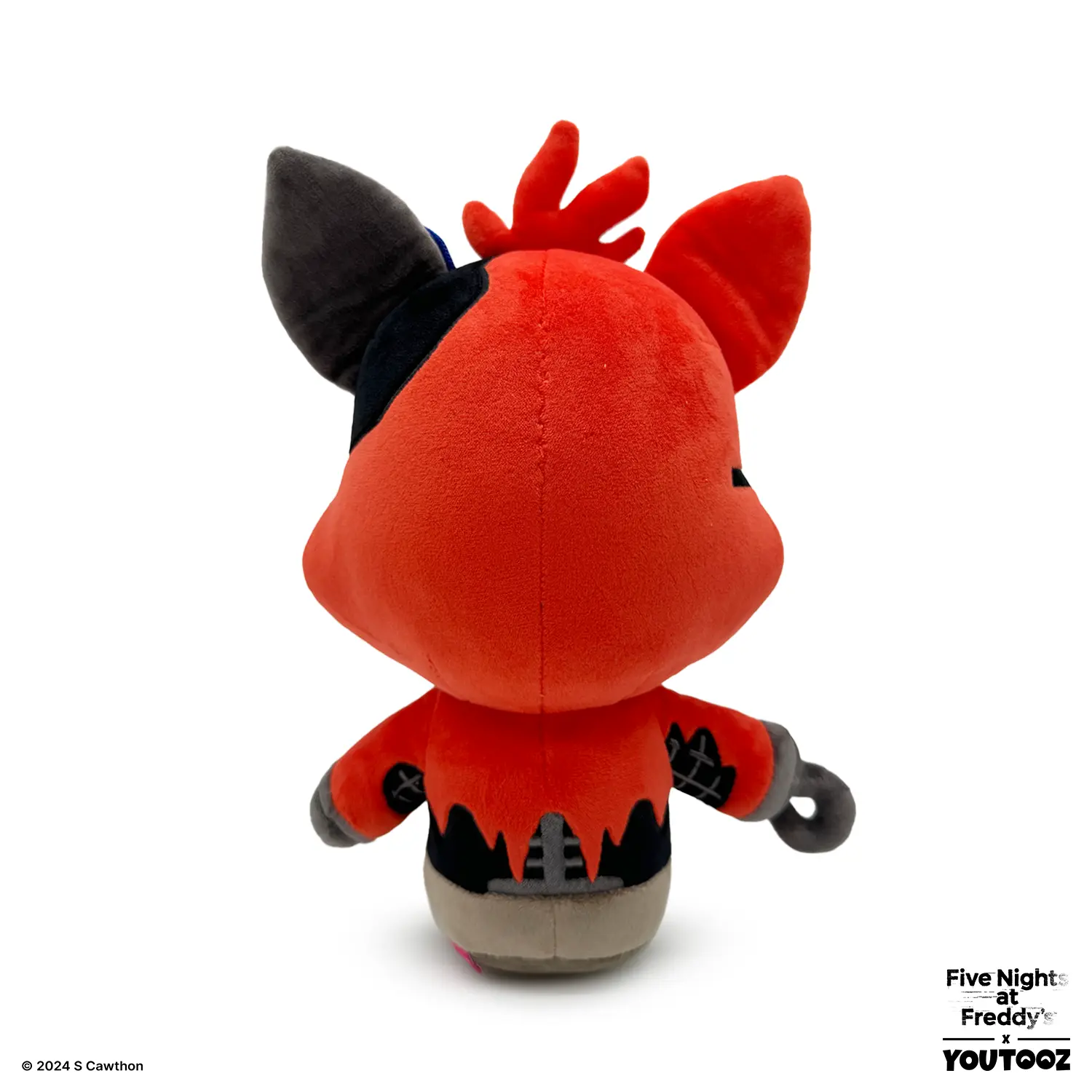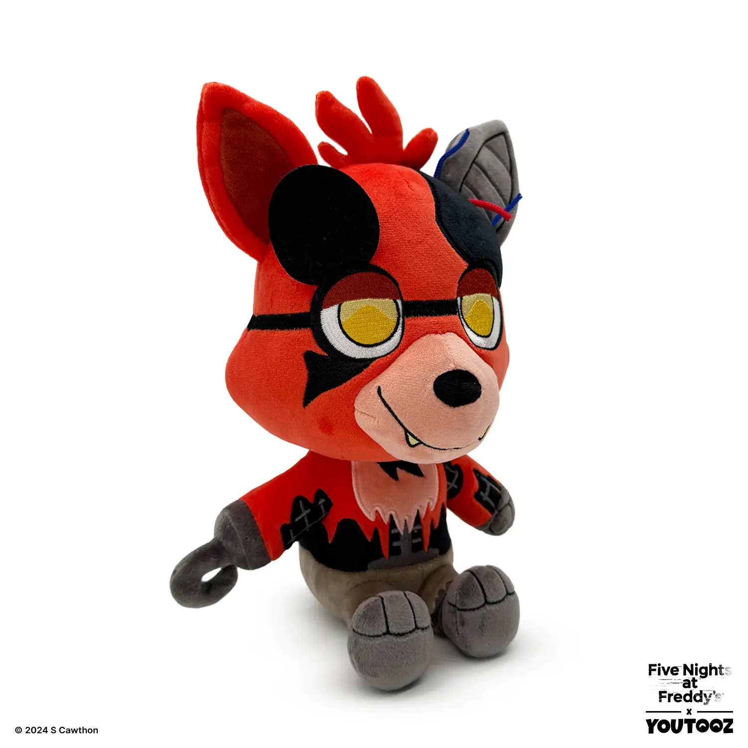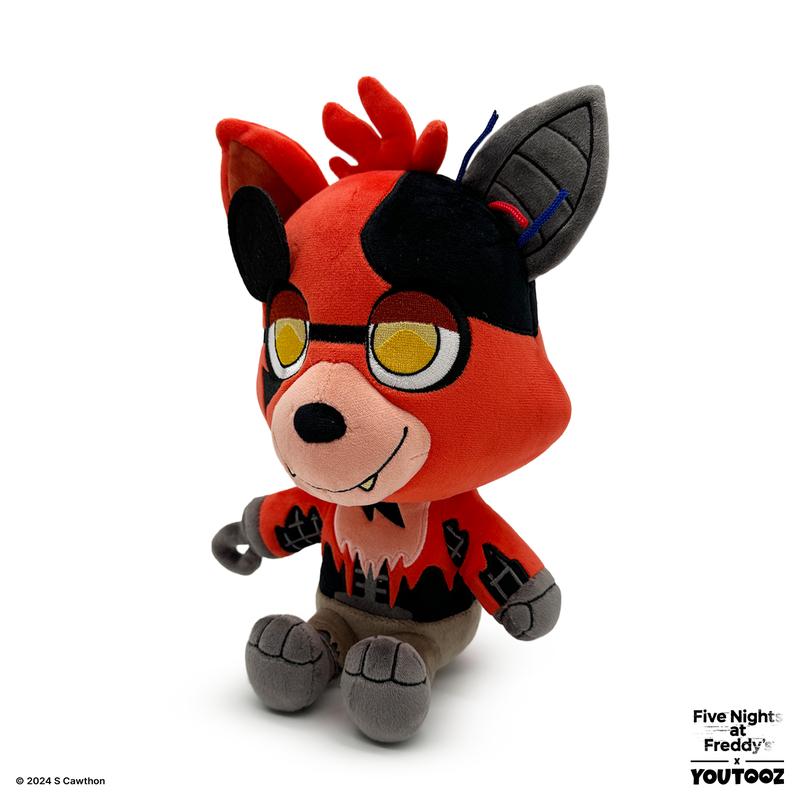 Withered Foxy has stalked their way back into Youtooz for a terrifyingly cuddly plush! With his eyepatch flipped up so he can see you clearly with both glowing yellow eyes and a smile crossing his light muzzle, fur has fallen away from his red face leaving the left ear bare and metal with wires poking out from its base. With his suit as tattered as his brown shorts, his metal spine and arms can be seen through the large missing chunks of fur as his legs are kicked forward and a hooked hand rests at his side. This plush is packed to the seams with 100% PP cotton and is made of a mixture of minky and drawstring materials, absolutely perfect for cuddling or stalking some dark hallways with!