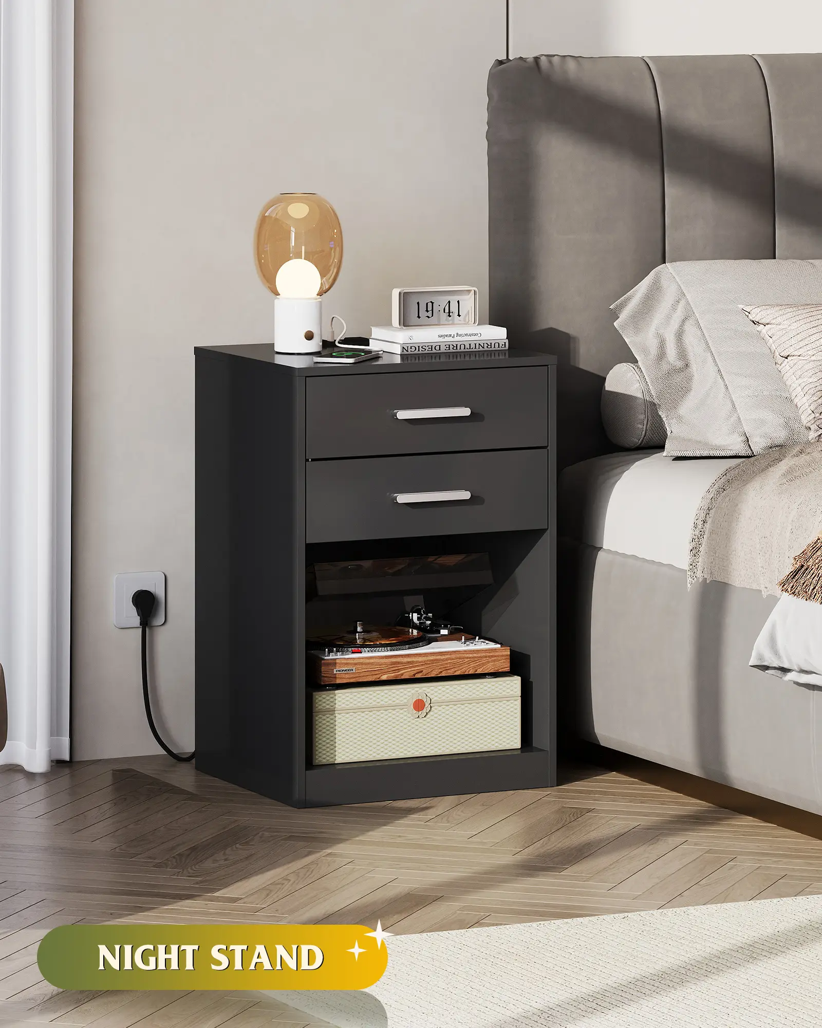 ·[Smart Storage Solutions] Each wooden bedside table includes 2 smooth-gliding drawers and 1 open shelf. The sleek metal handles and spacious top hold lamps, books, or decor—combining function and style.