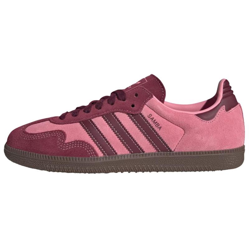 Wmns Adidas Samba OG - Pink Spark/Shadow Red. Classic retro design with a cushioned feel. Available in US sizes 5-12. True to size for most wearers. Ideal for casual wear and light activities. Durable rubber outsole. Comfortable fit with a snug midfoot. Slight heel lift for support. Perfect for everyday style and comfort.