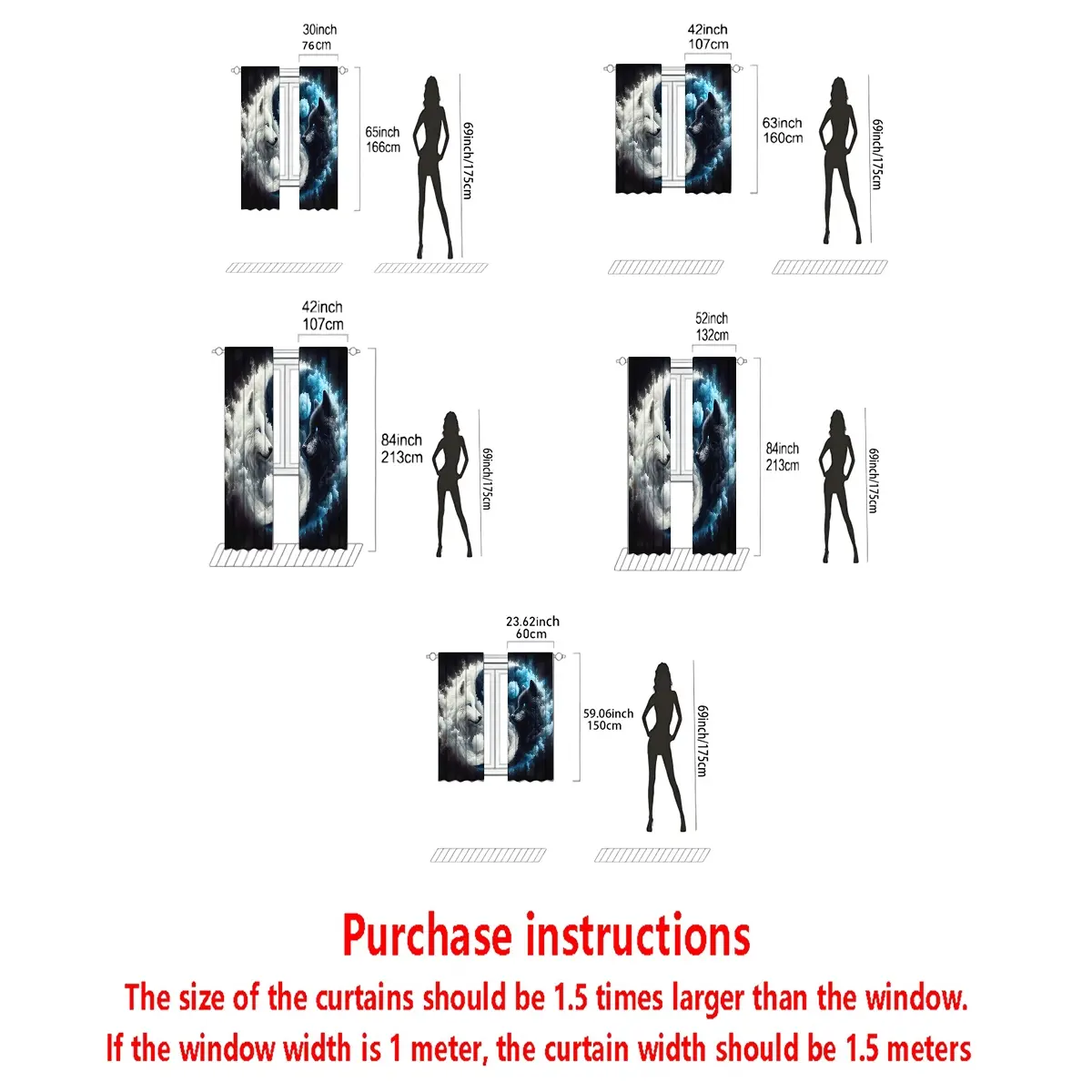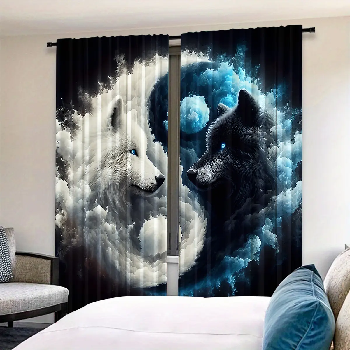 2-Piece & Wolf Cloud Moon Scene Digital Print Curtains, Semi-Transparent Polyester Fabric, Rod Pocket Design, Bedroom Living Room Decor