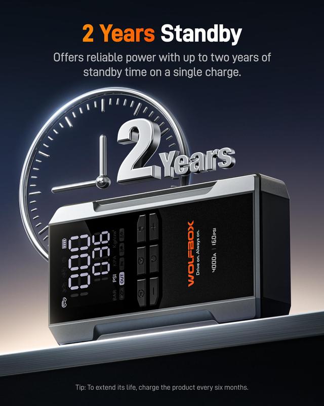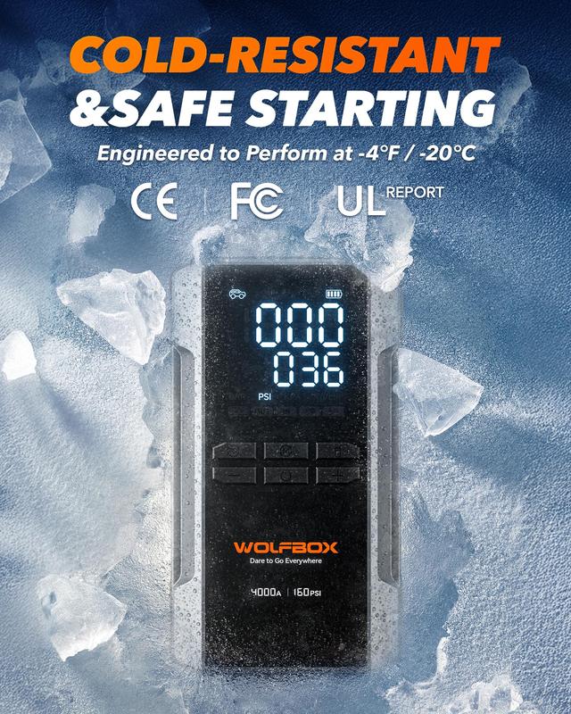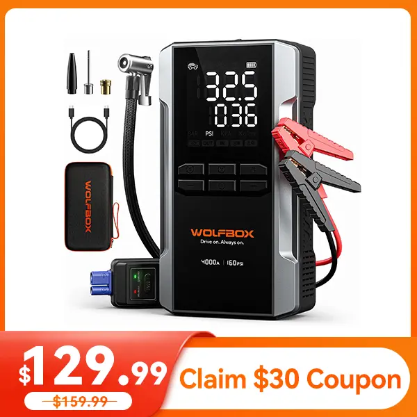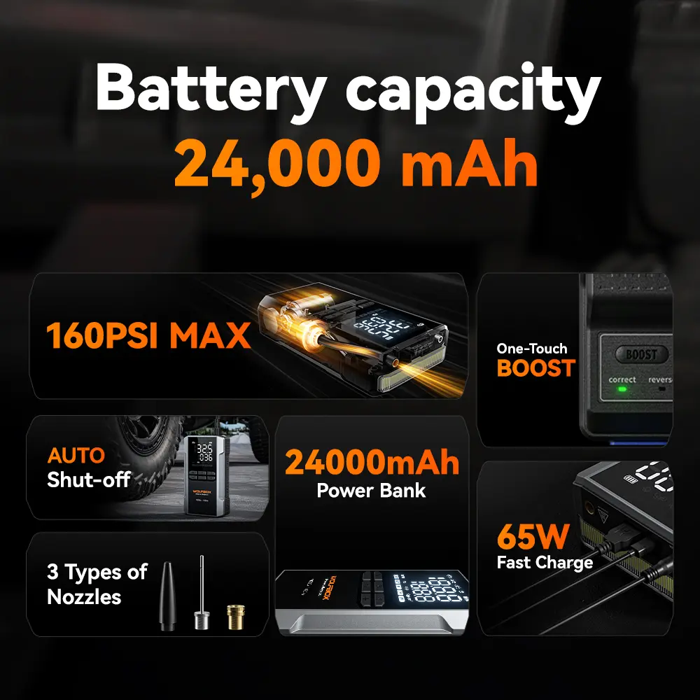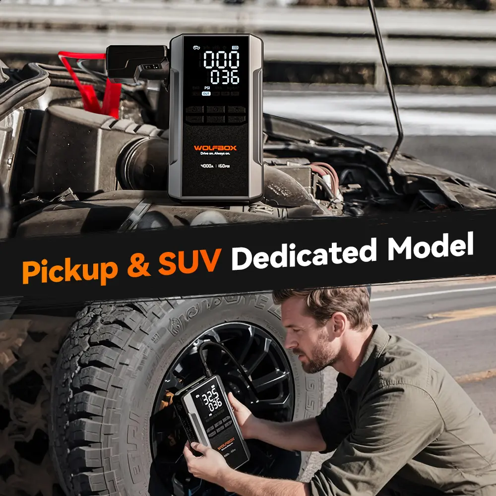 The newly upgraded WOLFBOX combines a jump starter and air compressor in one powerful device. With an 88.8Wh battery and a peak current of 4000A, it can start a completely dead 12V car battery, supporting up to 10L gas or 10L diesel engines. Designed for pickup trucks and smaller vehicles, it delivers multiple functions in one compact unit.