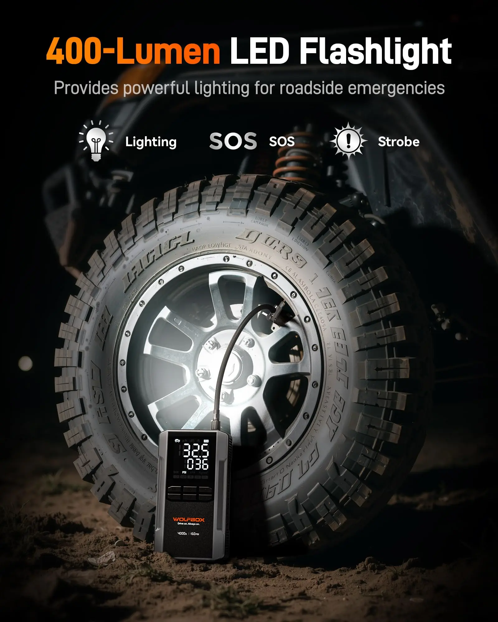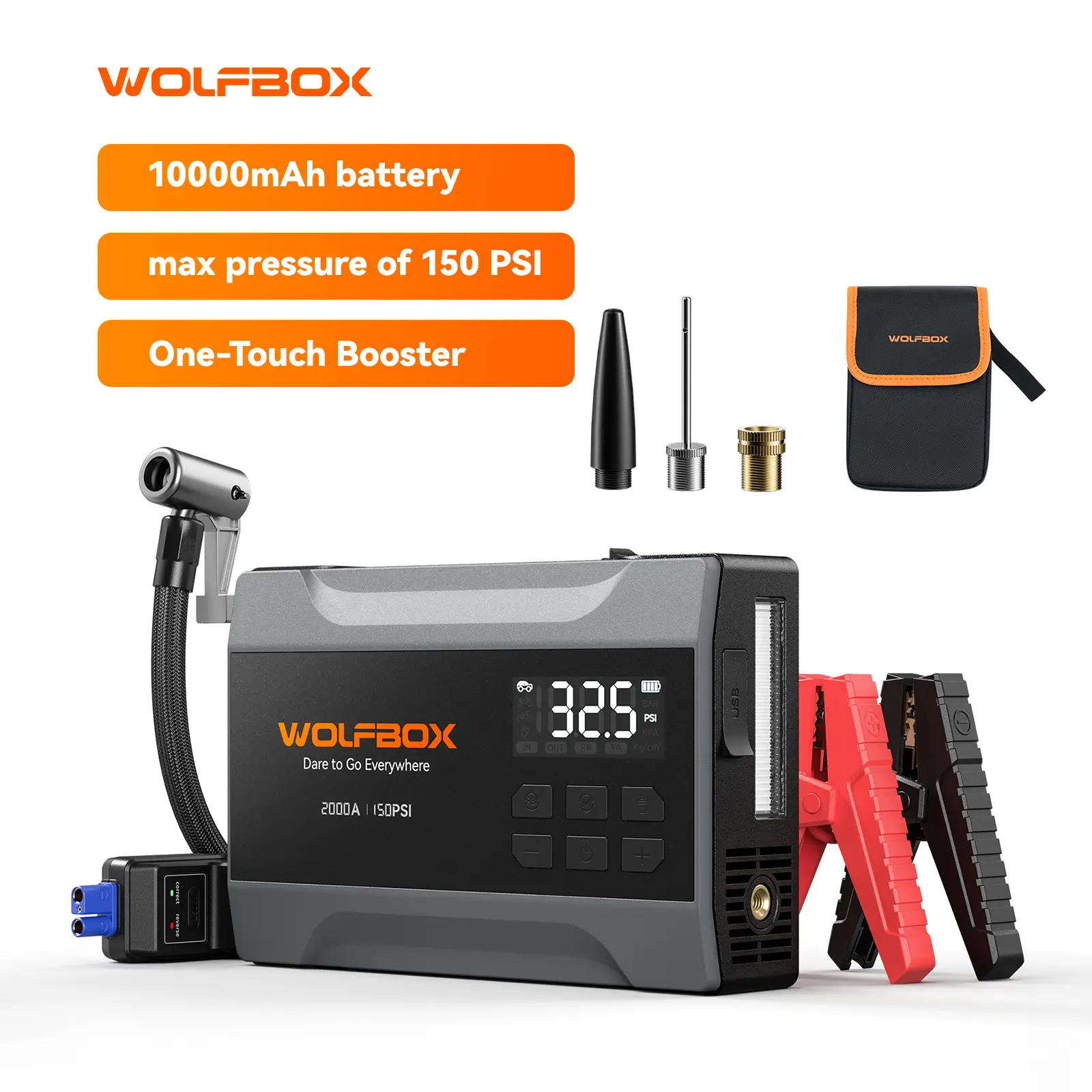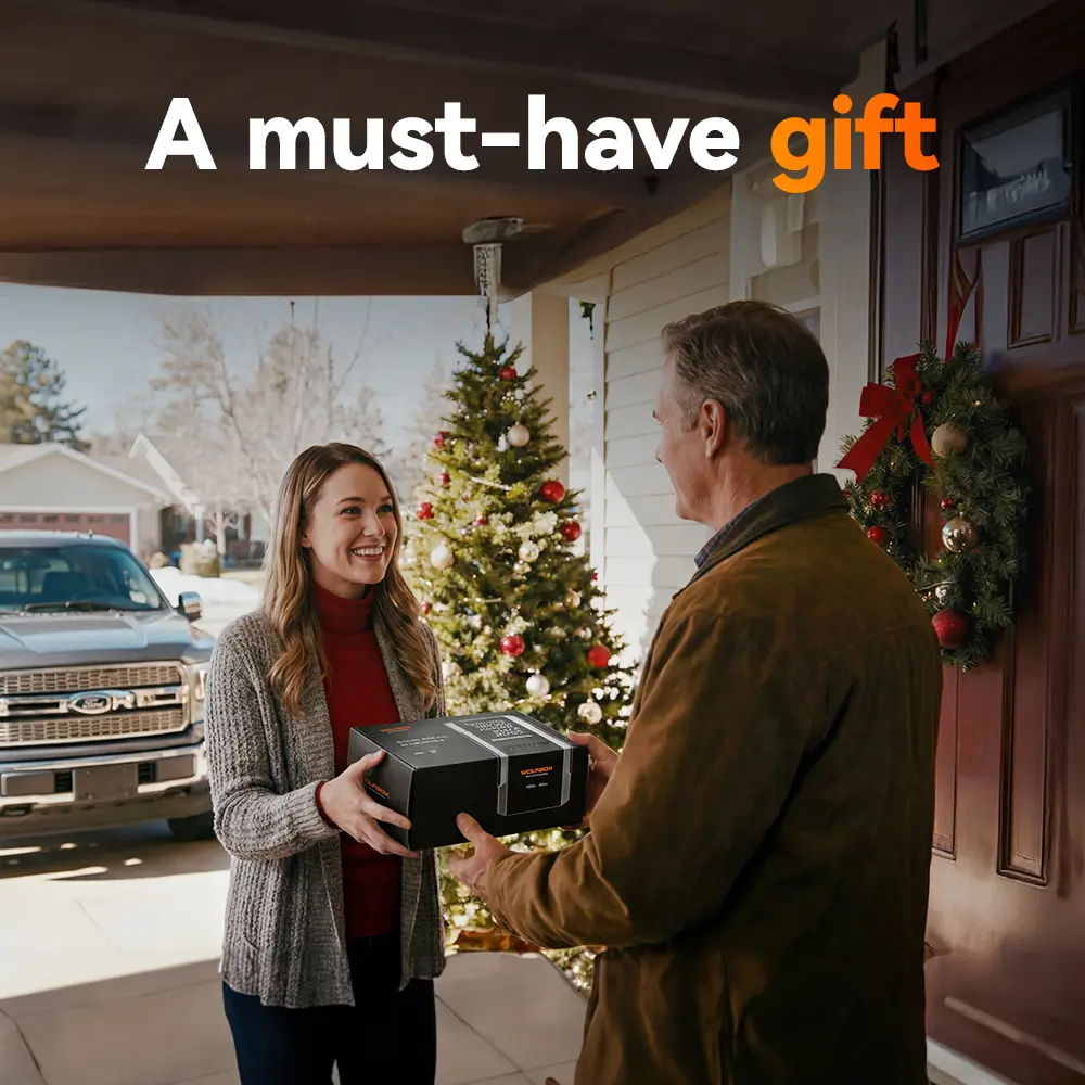 The newly upgraded WOLFBOX combines a jump starter and air compressor in one powerful device. With an 88.8Wh battery and a peak current of 4000A, it can start a completely dead 12V car battery, supporting up to 10L gas or 10L diesel engines. Designed for pickup trucks and smaller vehicles, it delivers multiple functions in one compact unit.