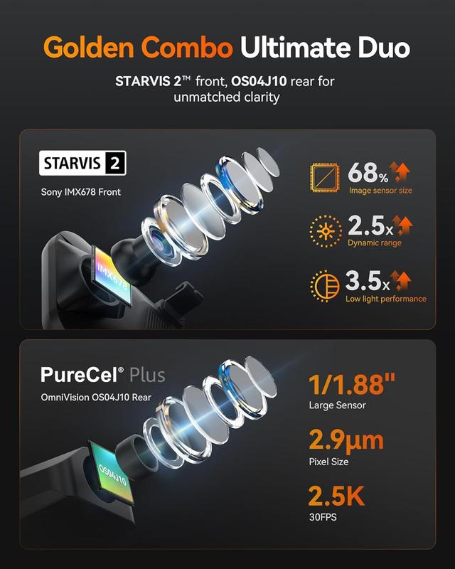 ·[STARVIS 2 4K Mirror Dashcam] Powered by the advanced STARVIS 2 IMX678, the WOLFBOX G900 Tripro's front camera delivers unmatched image clarity with 4K 3840*2160 resolution at 30FPS. STARVIS 2 offers a larger photosensitive area, enhanced low-light performance, and improved dynamic range. This ensures clearer, more vibrant footage with better contrast and detail, even in complex lighting situations