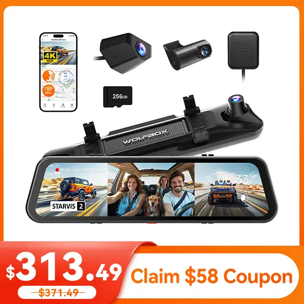 ·[4K Triple Channel Camera] This WOLFBOX rearview mirror camera records in 4K front, 2.5K rear, and 1080P interior for comprehensive coverage. The rear camera features a 1/1.88-inch large sensor, delivering superior light sensitivity with a 2.9μm pixel size. It supports 2.5K 2560*1440 resolution at 30FPS, Purecel Plus Technology enhances night vision, setting a new standard for visibility in the dark