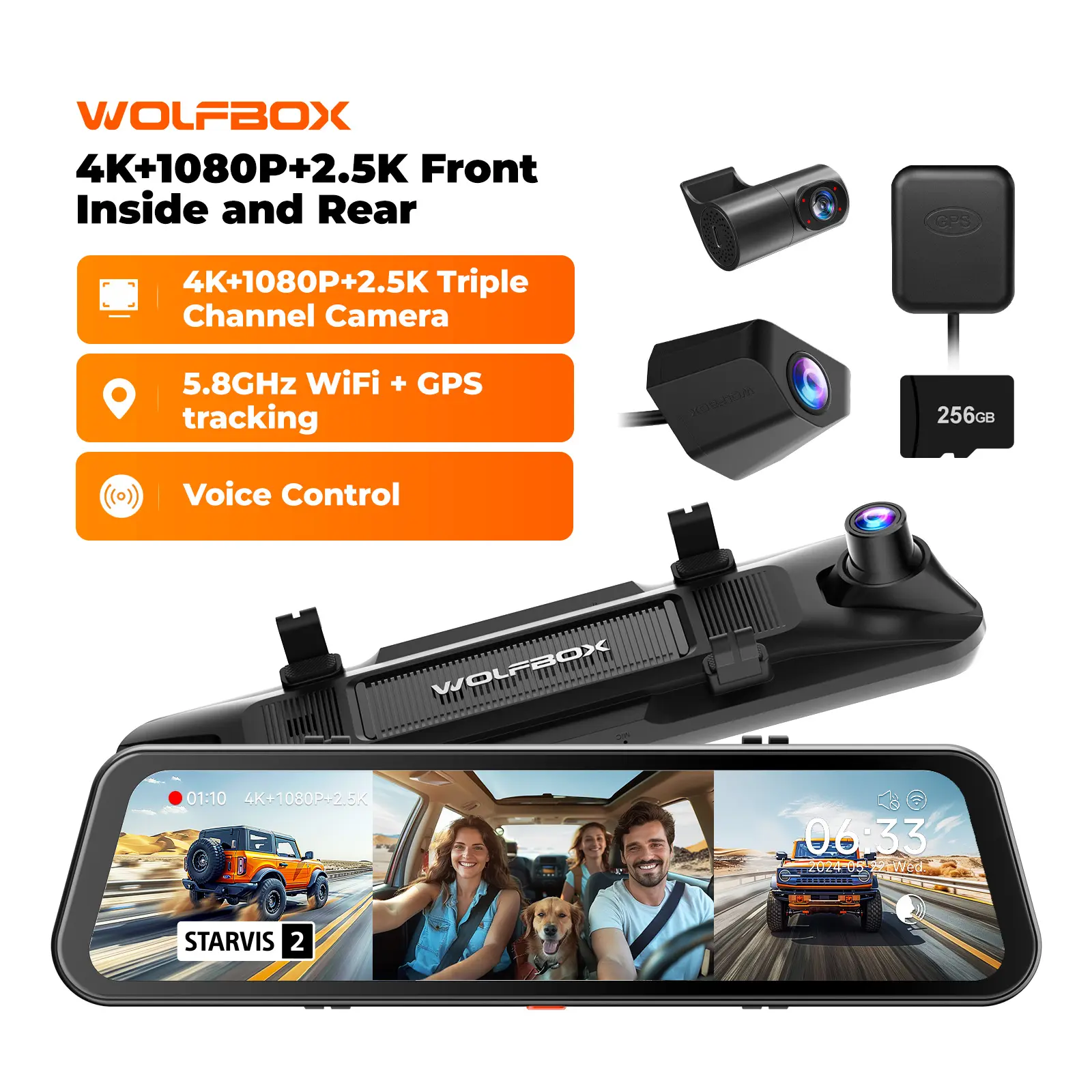 ·[Convenient 5.8GHz WiFi & Voice Control] Featuring 5.8GHz WiFi, the dash cam mirror provides faster and more stable connections to your smartphone. With the WOLFBOX app, you can easily view live footage, replay recordings, and share video. Experience the convenience of voice control, simply command your 3 channel dash cam to start recording or take photos, keeping your focus on the road