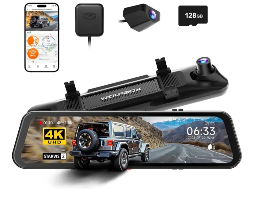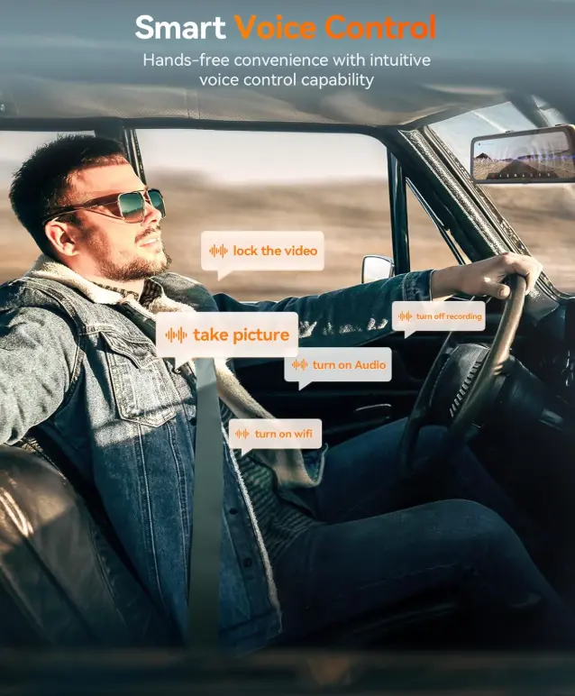·[Smart Voice Control] Manage essential features using voice commands. Enhance your driving safety and convenience by operating your WOLFBOX backup camera mirror effortlessly. Stay focused on the road while managing your rear view mirror dash cam functions with ease
