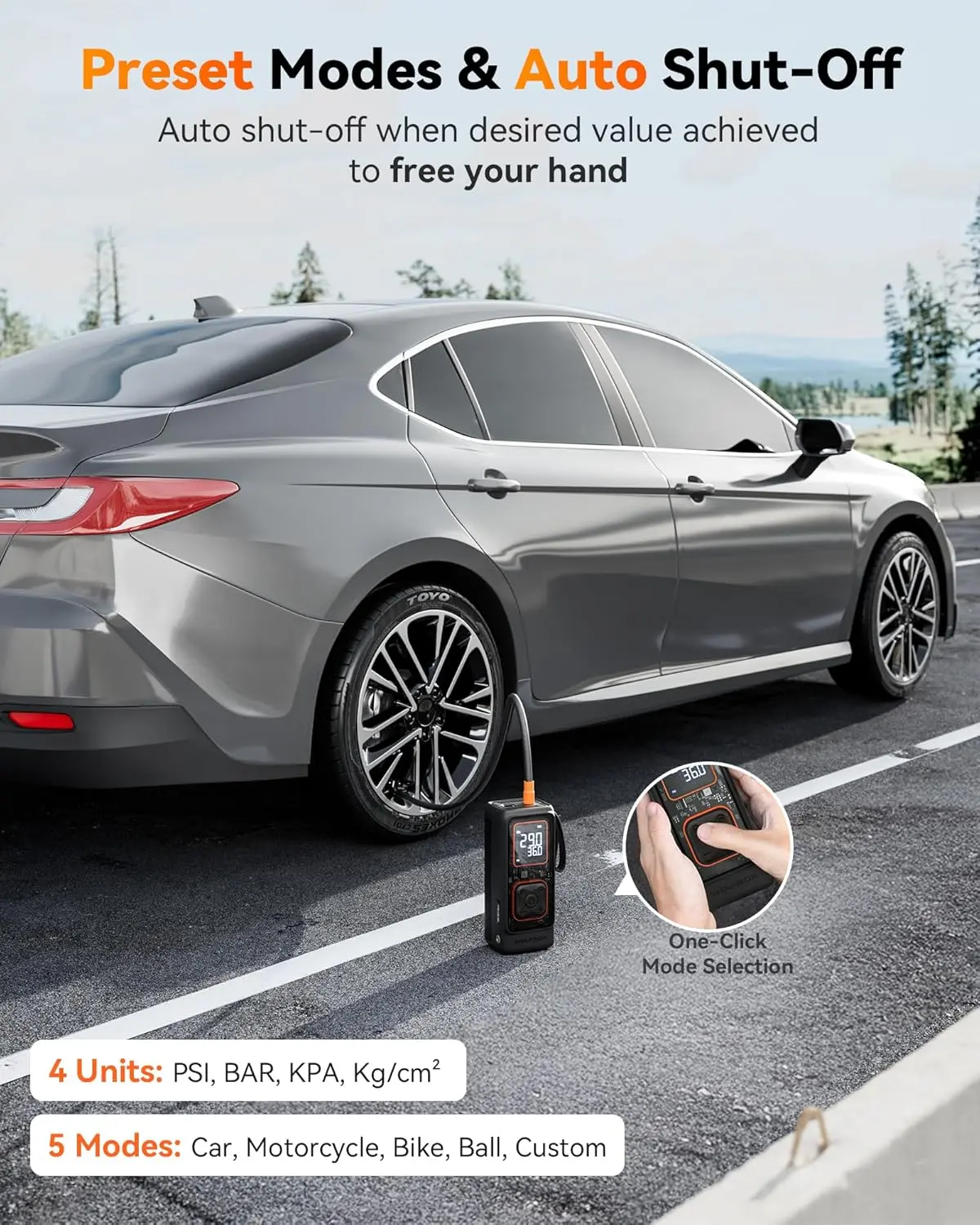 Preset 4 inflation modes and 4 pressure units (PSI, BAR, KPA, Kg/cm²). One-click operation and auto shut-off ensure convenience. Advanced users can customize modes for precise pressure settings. The built-in battery refills up to 24 sedan tires on a full charge.