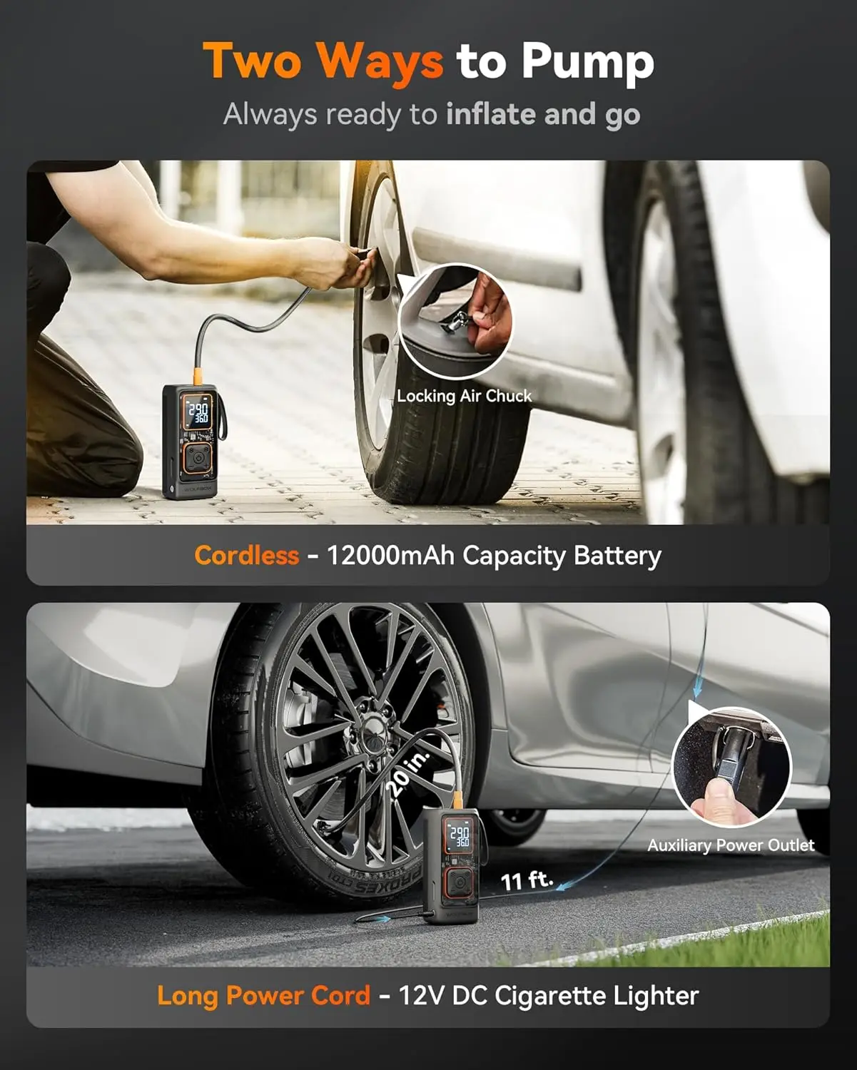 Equipped with a 12000mAh battery, this inflator refills up to 24 sedan tires. When the battery runs low, the 11' power cord connects to your car's cigarette lighter for continuous use. The USB-C input/output port supports 40W fast charging, with a 2-hour full recharge time.