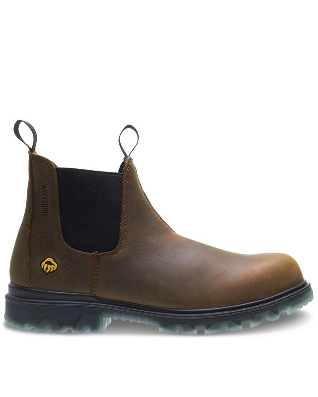 Full-grain leather. 4" shaft. Round composite safety toe. Waterproof. Cushioned footbed. Nylon shank. Oil and slip resisting, non-marking rubber outsole. Moisture-wicking lining. ASTM F2413 electrical hazard/protective toe standard. Elastic side gores.
