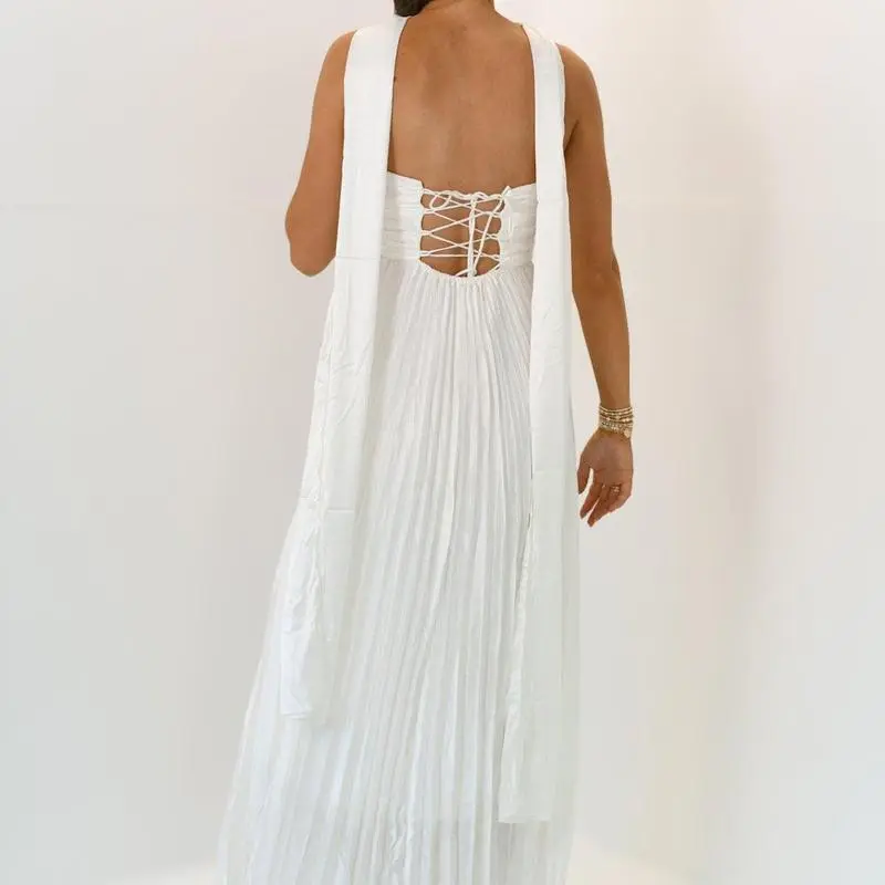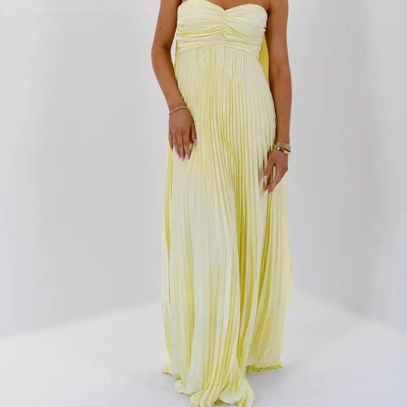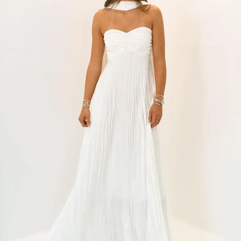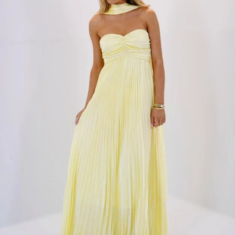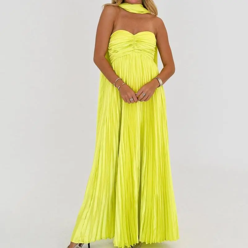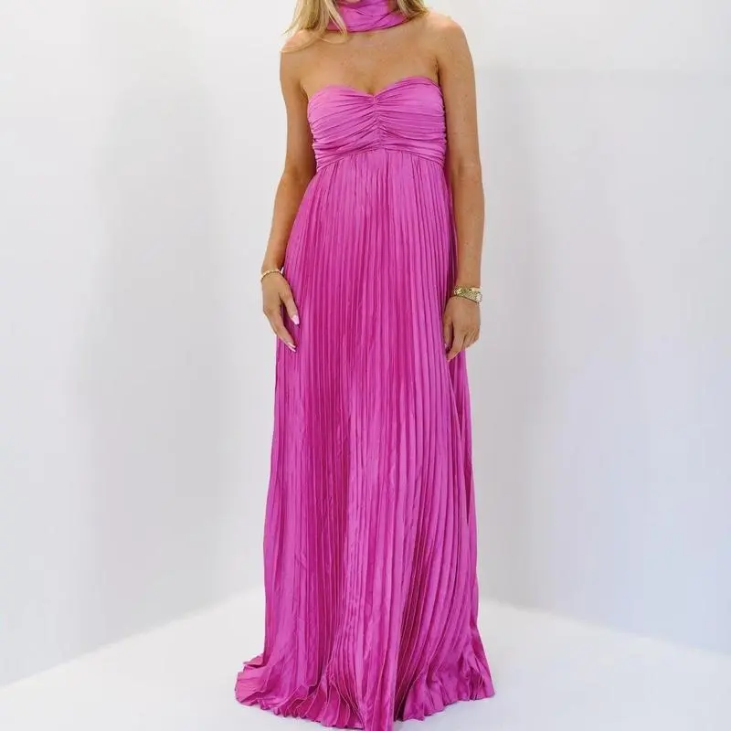 Women Long Dress Solid Color Pleated Tube Dress Summer Fashion Backless Casual Strapless Dress with Choker Scarf Light Polyester