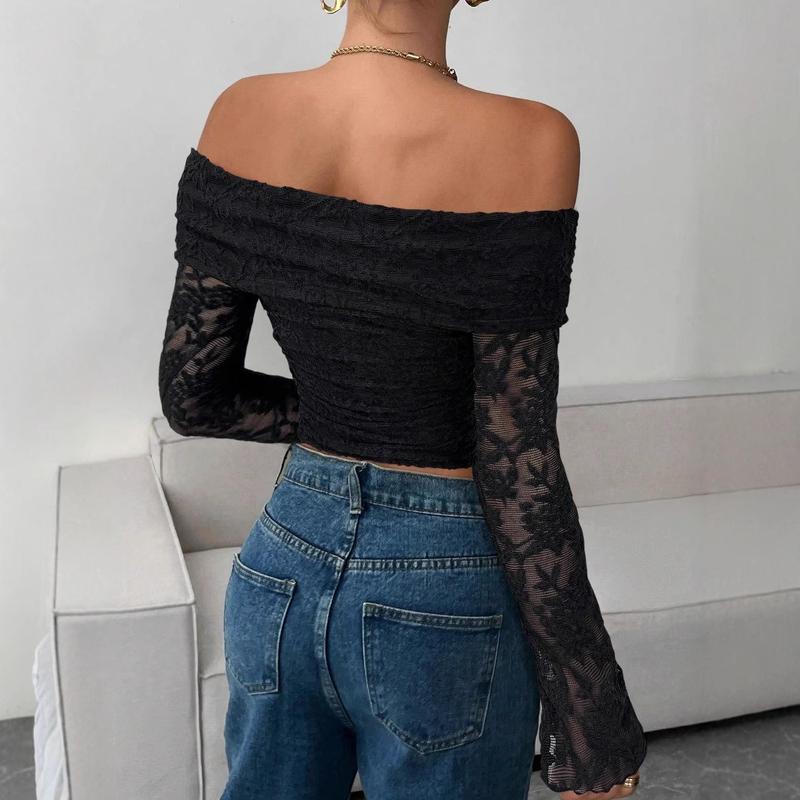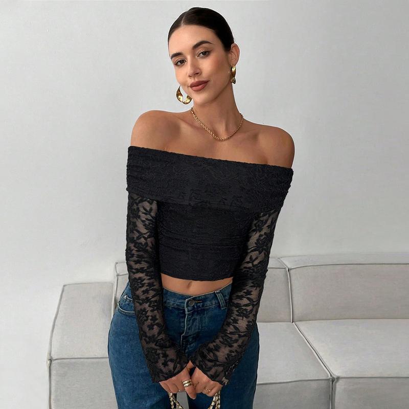 Elevate your wardrobe with this floral lace slim fit blouse. Perfect for going out during the fall season, it features an off shoulder design for a stylish edge. The mesh material adds a touch of elegance and breathability. Ideal for women seeking a chic yet comfortable outfit. Pair it with your favorite jeans or skirts for a versatile look.