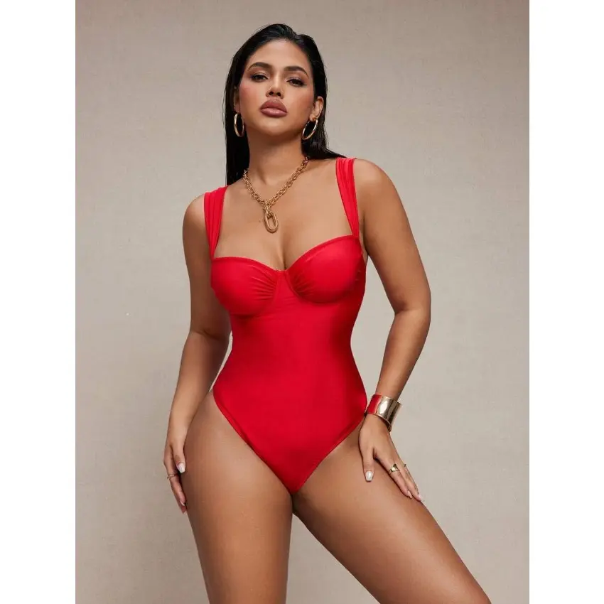 Women Plus Size Shiny Fabric Ruched Wrap One Piece Swimsuit For Spring Summer Beach Holiday Wear, Tummy Control Design With Flattering Supportive FitWomen Plus Size Shiny Fabric Ruched Wrap One Piece Swimsuit For Spring Summer Beach Holiday Wear, Tummy Control Design With Flattering Supportive Fit