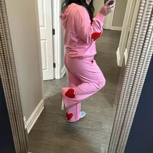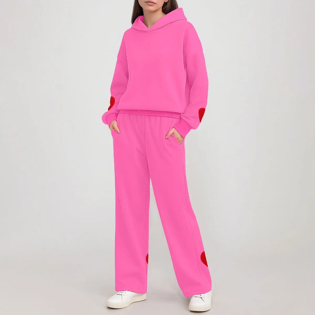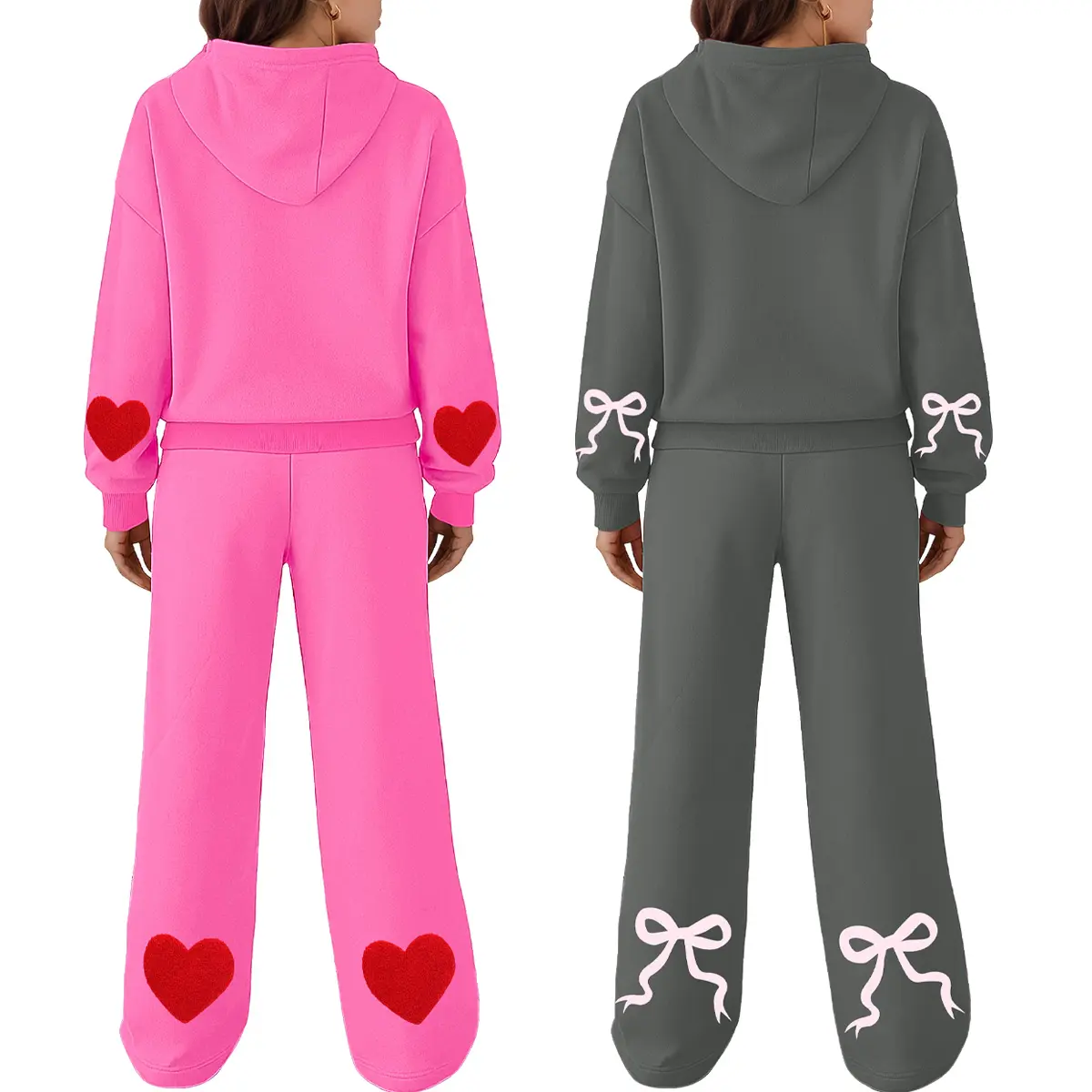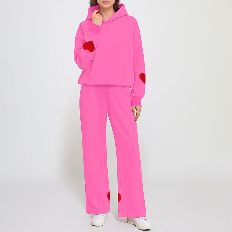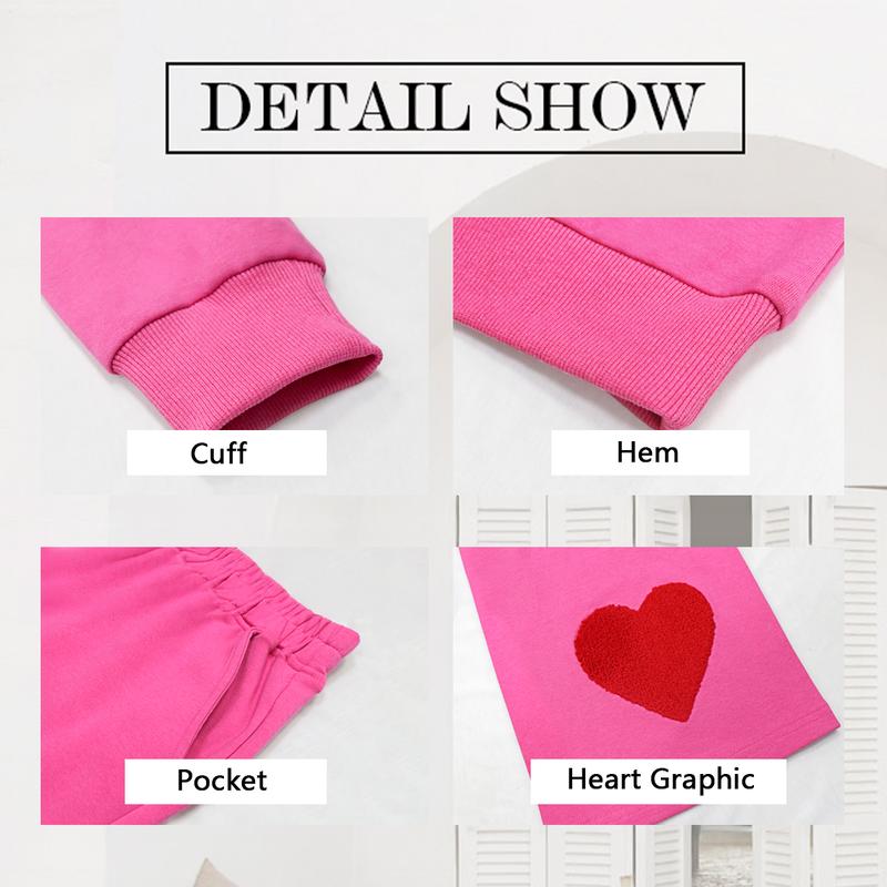 ·Design – This stylish hoodie features dropped shoulders, full-length sleeves, and comes in both solid tones and fun prints like bows, hearts, or cherries. Paired with high-rise, wide-leg sweatpants designed with side pockets and a flattering elastic waistband that enhances your shape without compromising comfort.