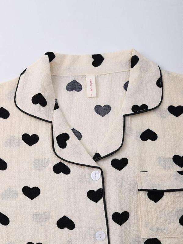 Women's Heart Print Lapel Neck Top & Elastic Waist Shorts Pyjama Two-piece Set, Casual Comfy Short Sleeve Top & Shorts PJ Set, Ladies Sleepwear for All Seasons