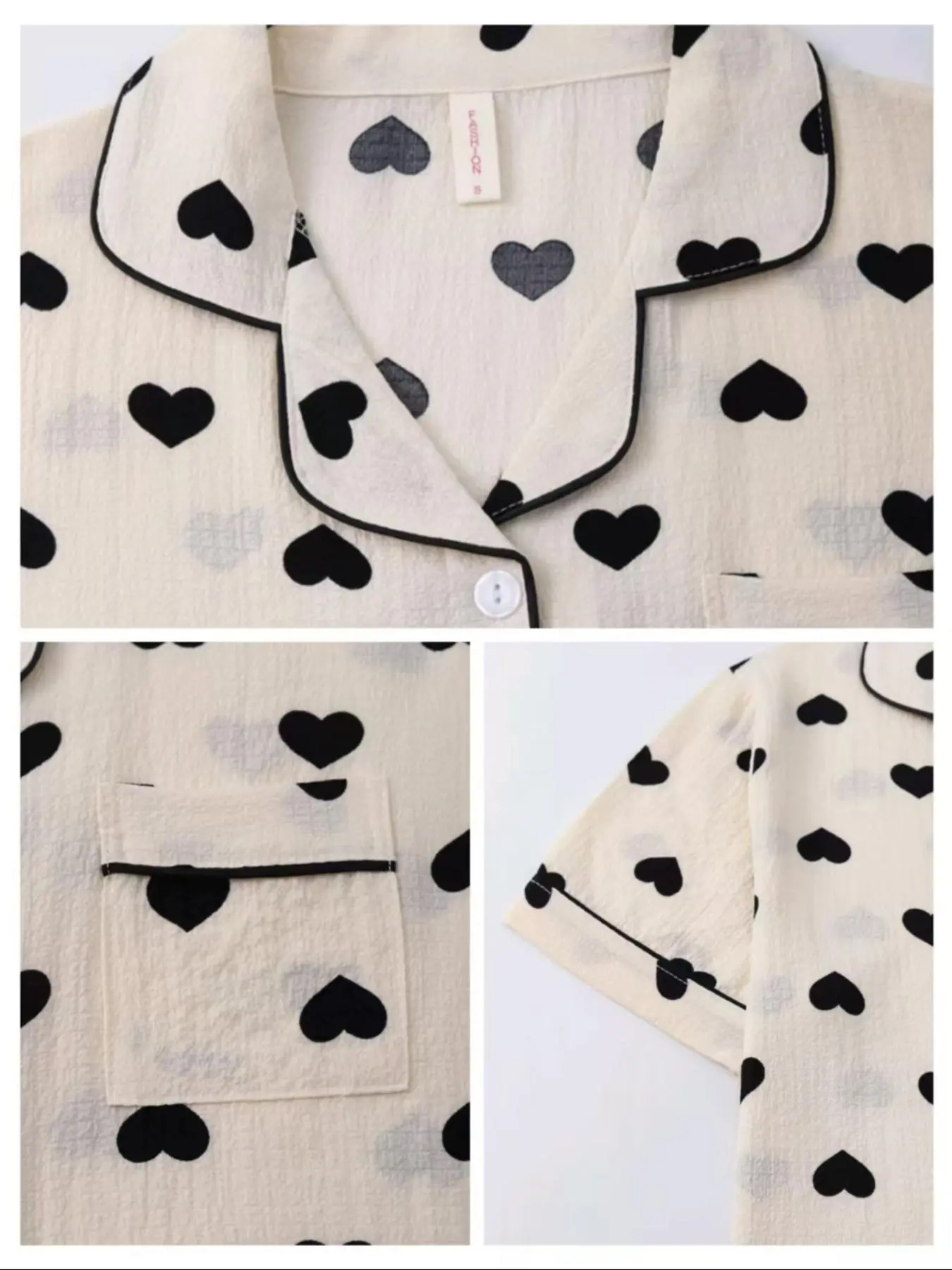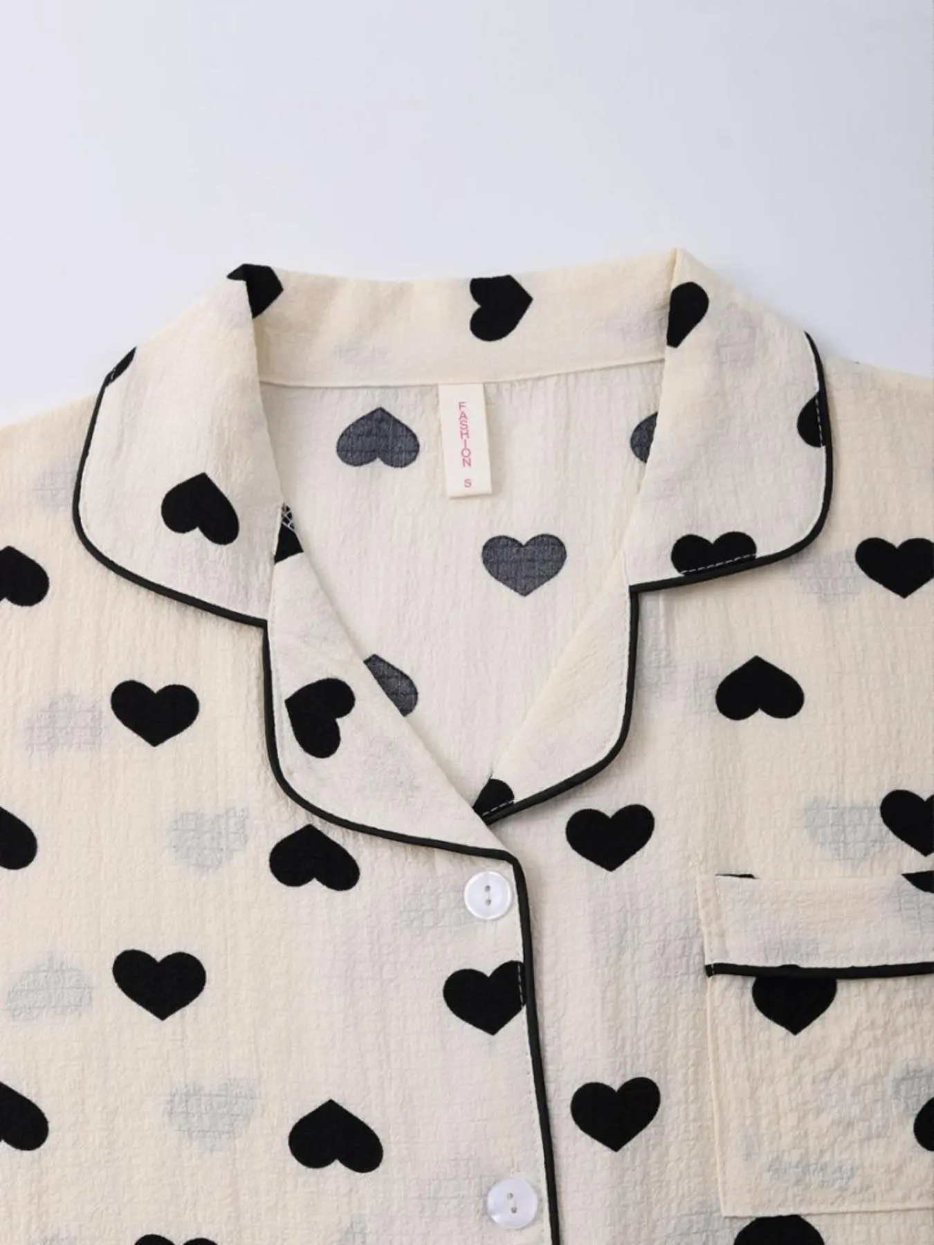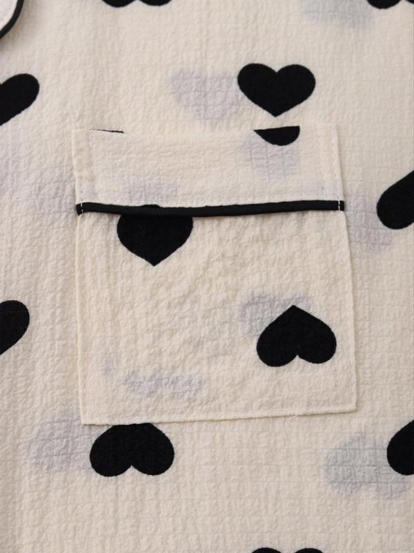 Women's Heart Print Lapel Neck Top & Elastic Waist Shorts Pyjama Two-piece Set, Casual Comfy Short Sleeve Top & Shorts PJ Set, Ladies Sleepwear for All Seasons #pajamas #sleepwear #pajamaset #loungewearset #womenspjs #holidaypajamas #womenspajamas #sweaterset #sleepwearset #womenssleepwear