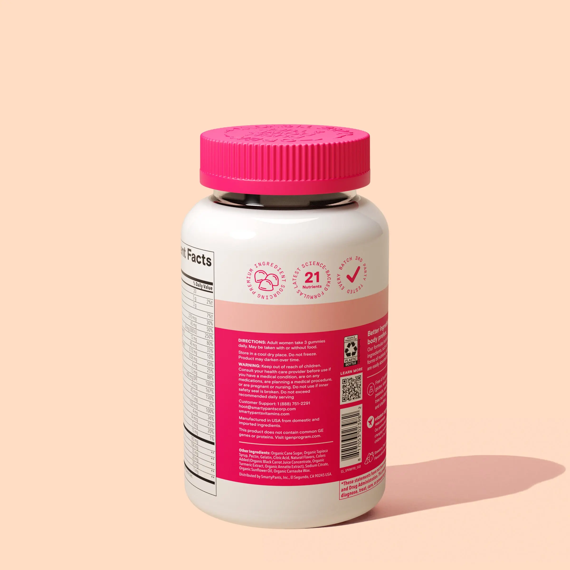 SmartyPants Women’s Plus Multi & Omegas provides 21 daily nutrients. It includes vitamins C, D3, B12, A, biotin, and folate. Additionally, it contains Omega-3s at 250 mg per 3 gummies. This supplement supports immune function and bone health. Perfect for women seeking a comprehensive nutrient-rich supplement.