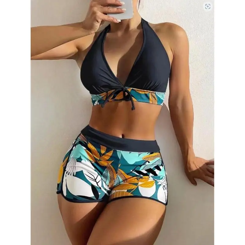 Women’s Tropical Print Tie Front Tankini Set – Two-Piece Halter Swim Top & Shorts for Summer Beach & Vacation Drawstring Bathing Suits