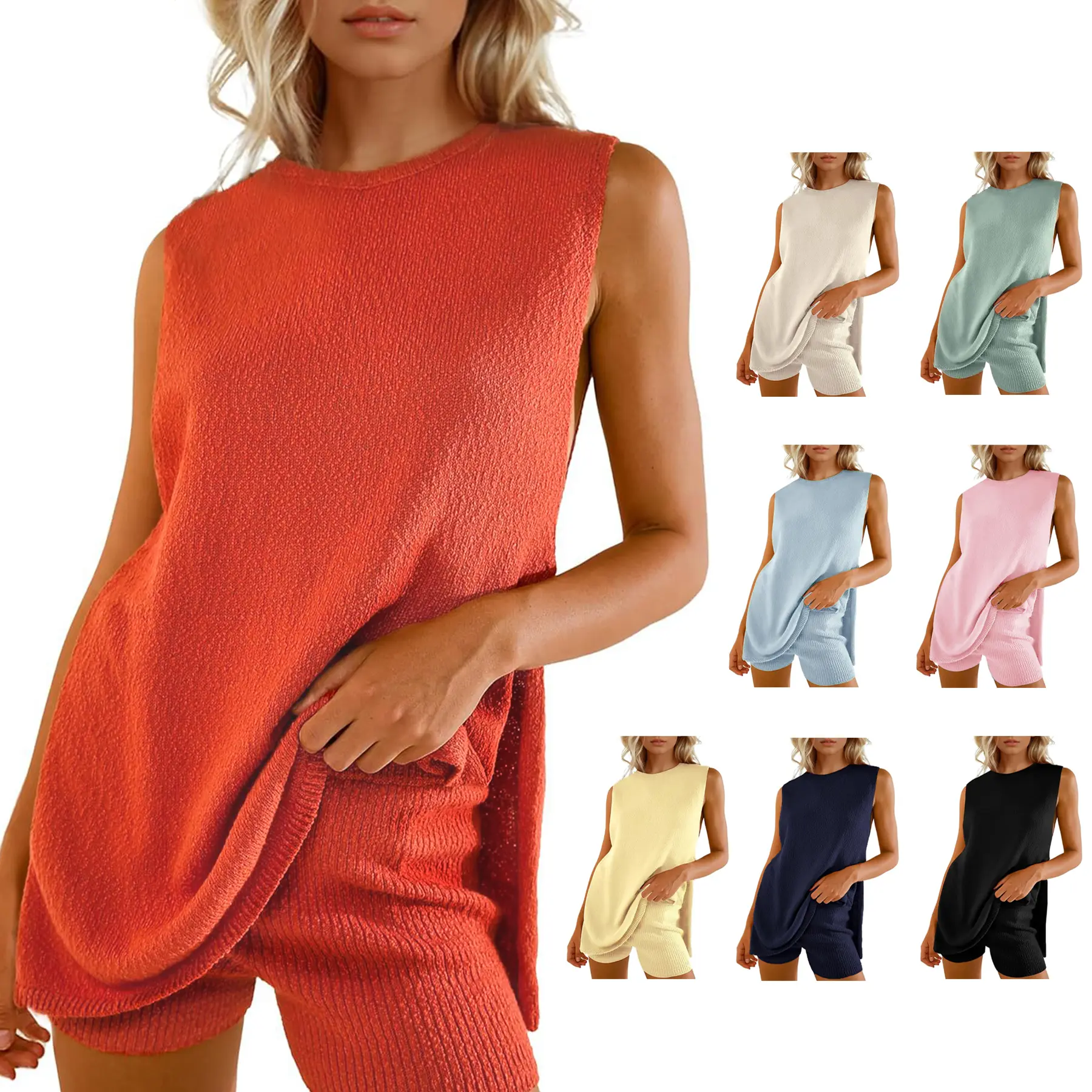 Design: Casual tunic matching set for women features with high boat neckline, dropped armholes, vented hemline, loose fit sleeveless tunic tops, slim fit throughout shorts, two piece sweater sets for women summer.