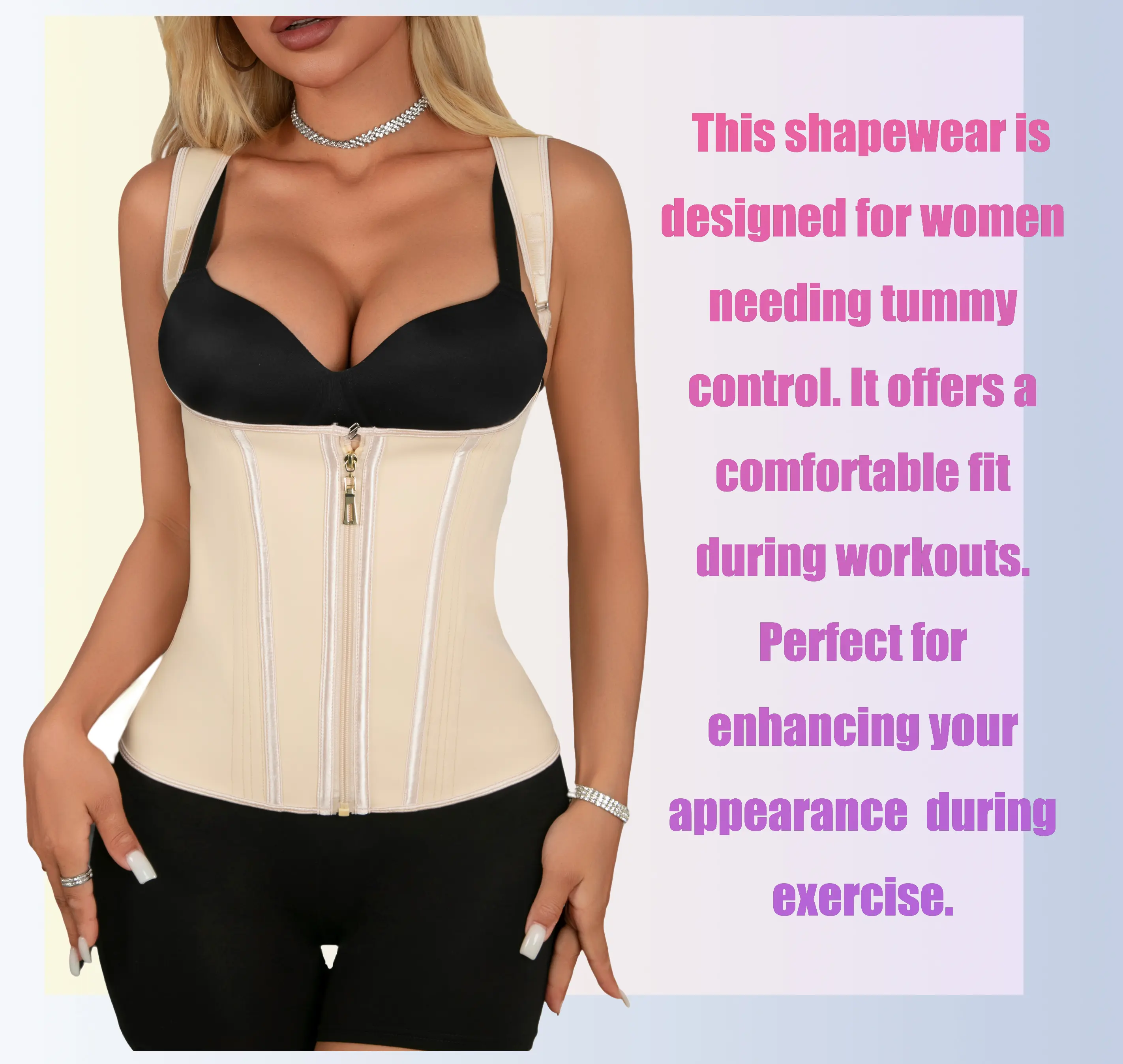 first of all the color is super cute and it is super comfy and smooth to wear as a first time waist trainer wearing i cannot wait to buy another