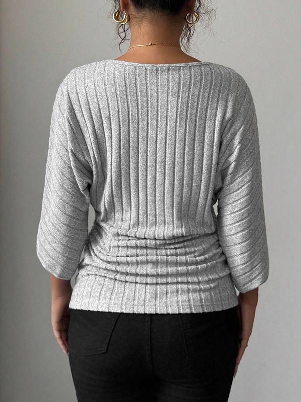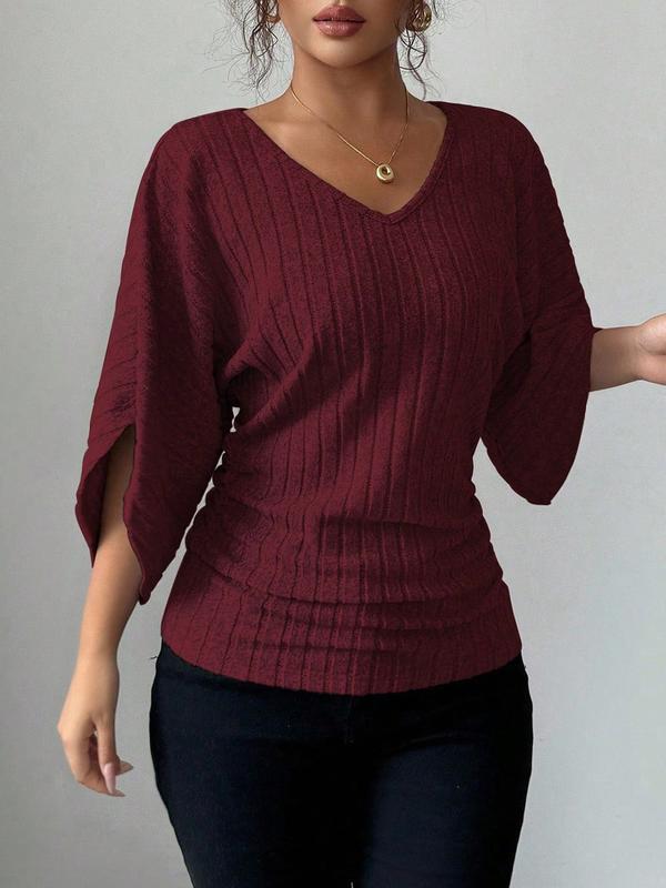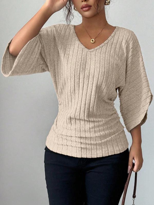 Women's 1pc Solid Color Ribbed Batwing Sleeve V-Neck Blouse, Soft Stretchy Knit Fabric, Relaxed Fit, Vertical Ribbed Texture, Curved Hem Detail #womenclothing #sweaters #longsleevetop #vnecktshirt #womensclothes #womenshirt #womensclothingtiktokshop #womensshirt #womenssweater #plussizesweaters