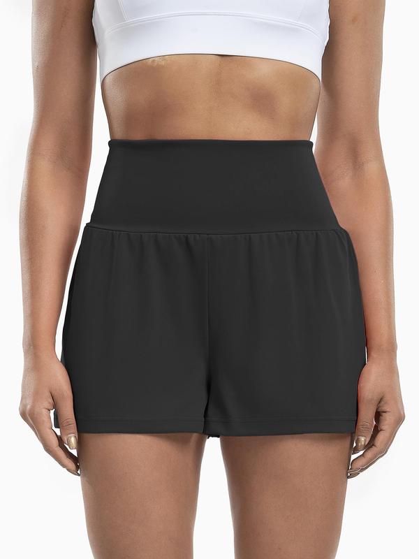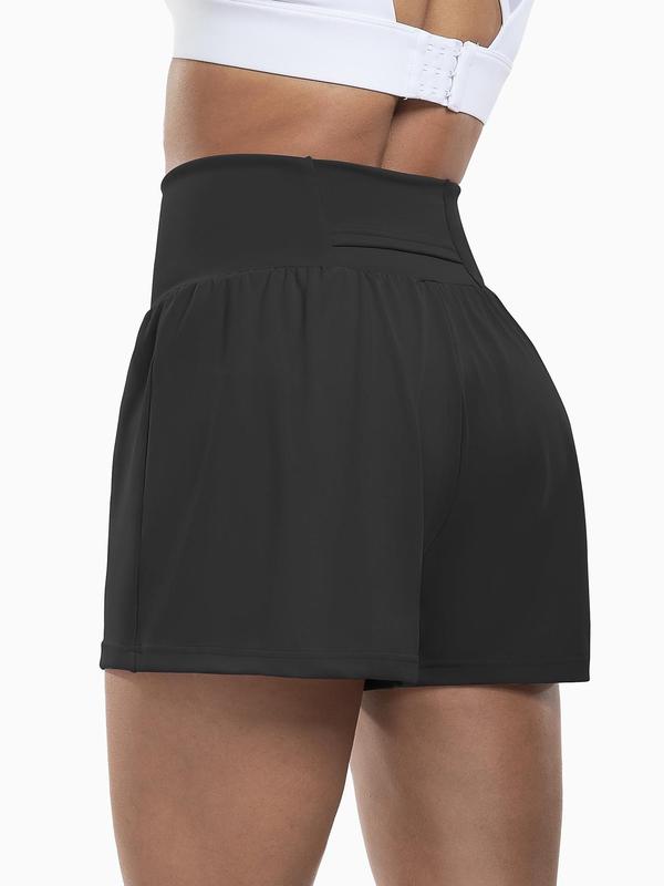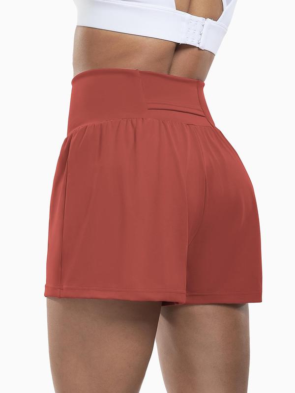 Women's Solid Color Pocket Sports Shorts, Comfy Breathable 2 in 1 Shorts for Yoga Gym Workout Running, Ladies Sportswear for All Seasons