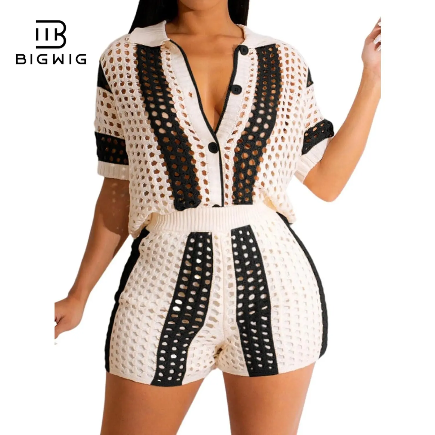 Design: This shorts sets women 2 piece outfits with contrast color design will make you look more vibrant and fashionable. Hollow out knit fabric makes you look sexy and eye-catching.