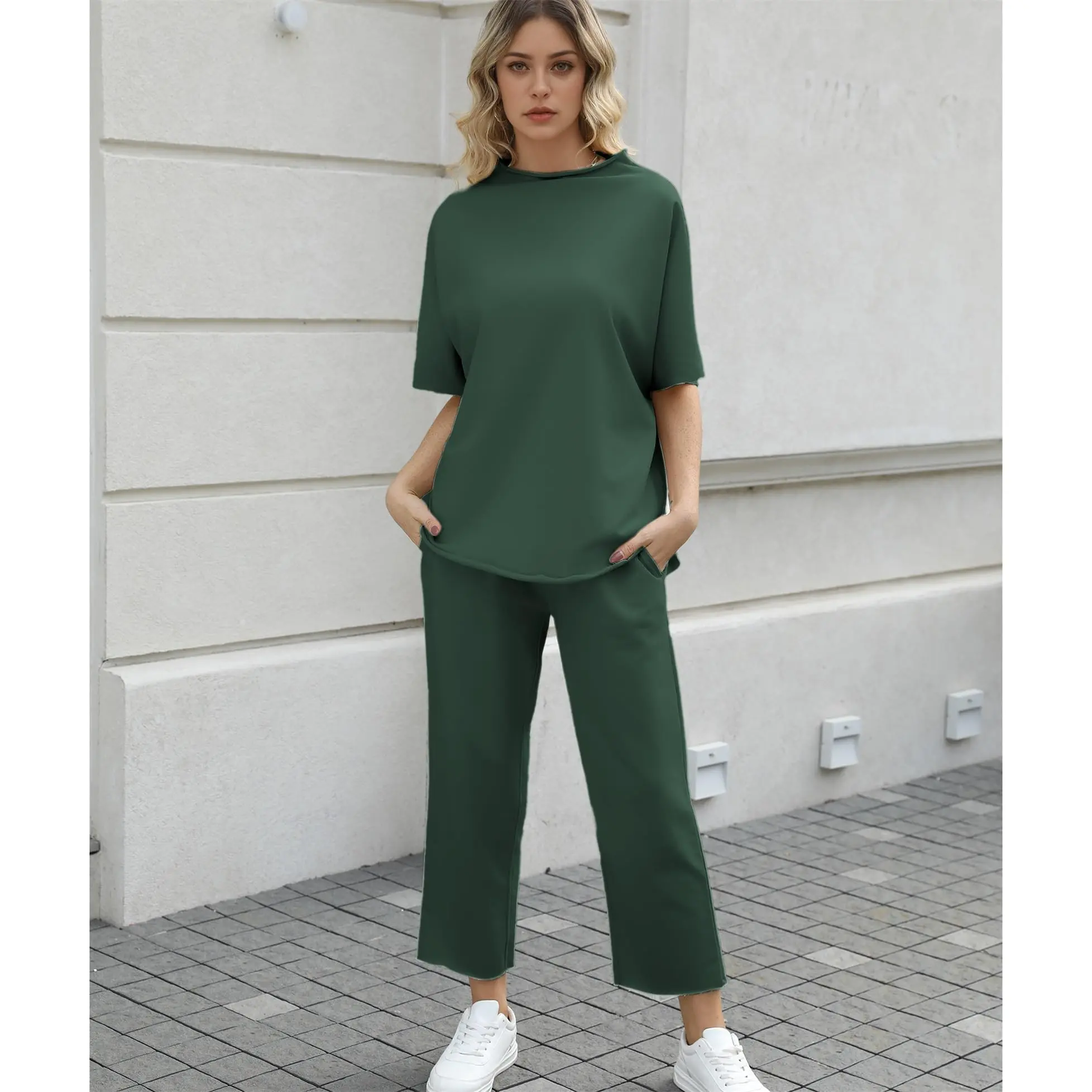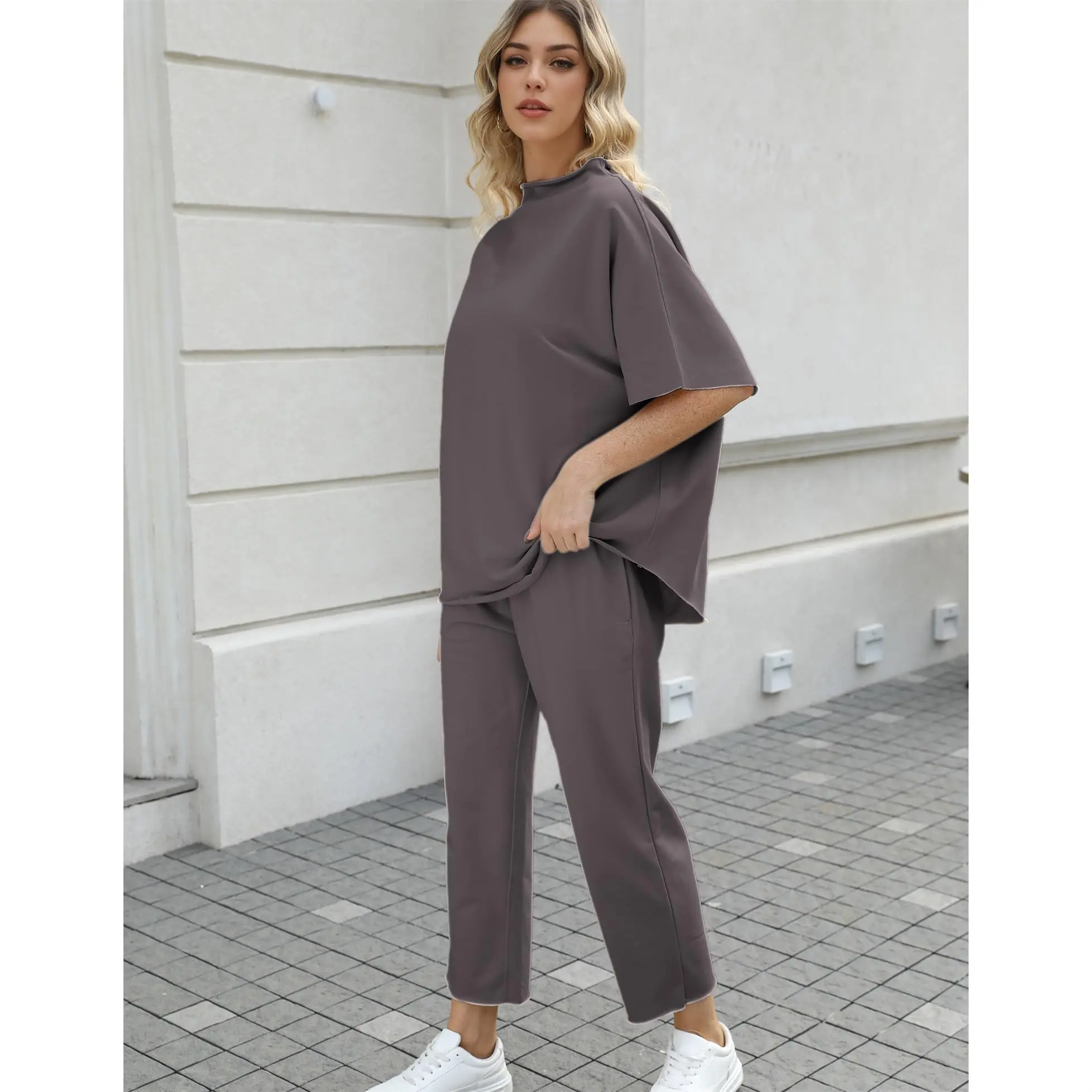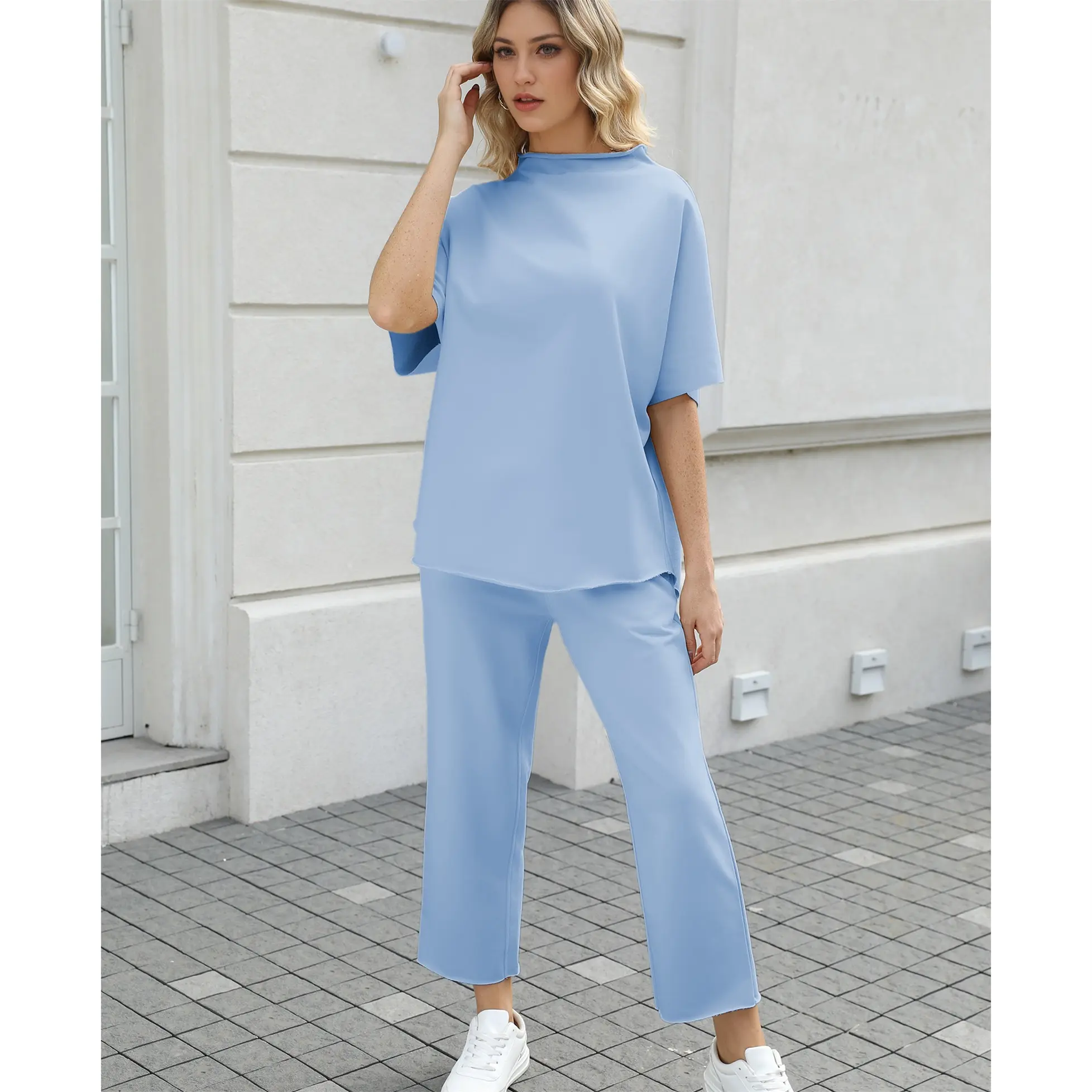 ·Feature: Casual two piece outfits for women, 3/4 elbow sleeve length capelet has a hand-cut raw hem, rolled funnel neck, crew neck, solid color, loose fit, skin friendly, pullover tops, elastic waist, wide leg pants, two side pockets for your keys and lipsticks.