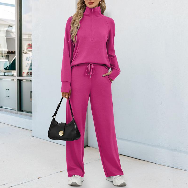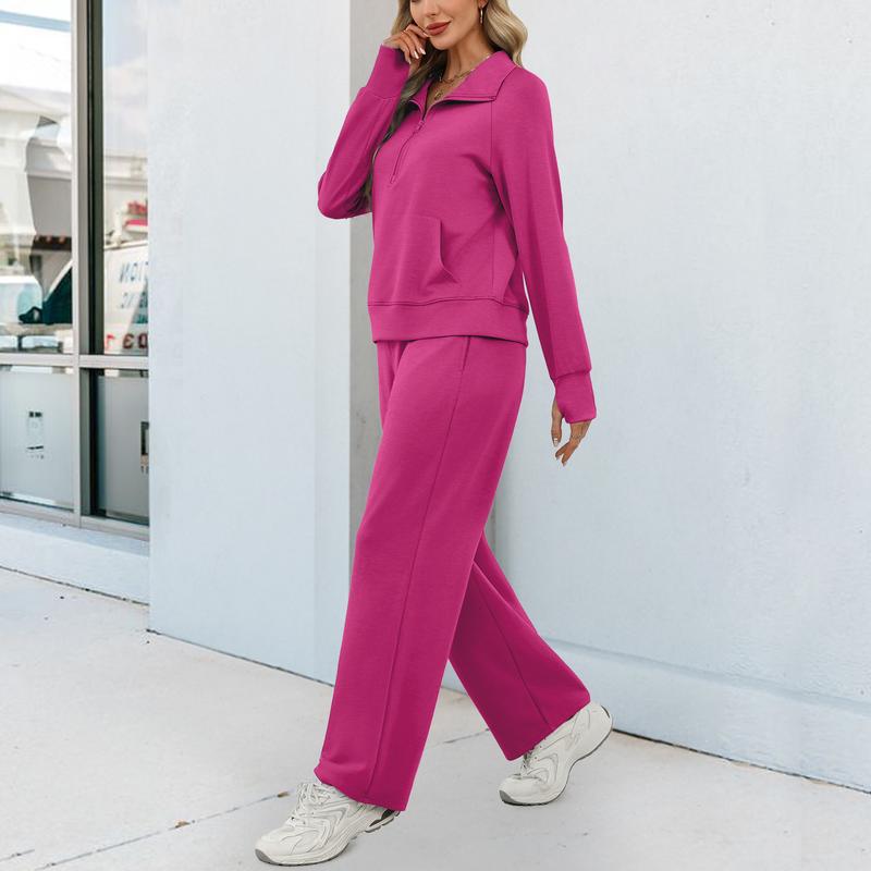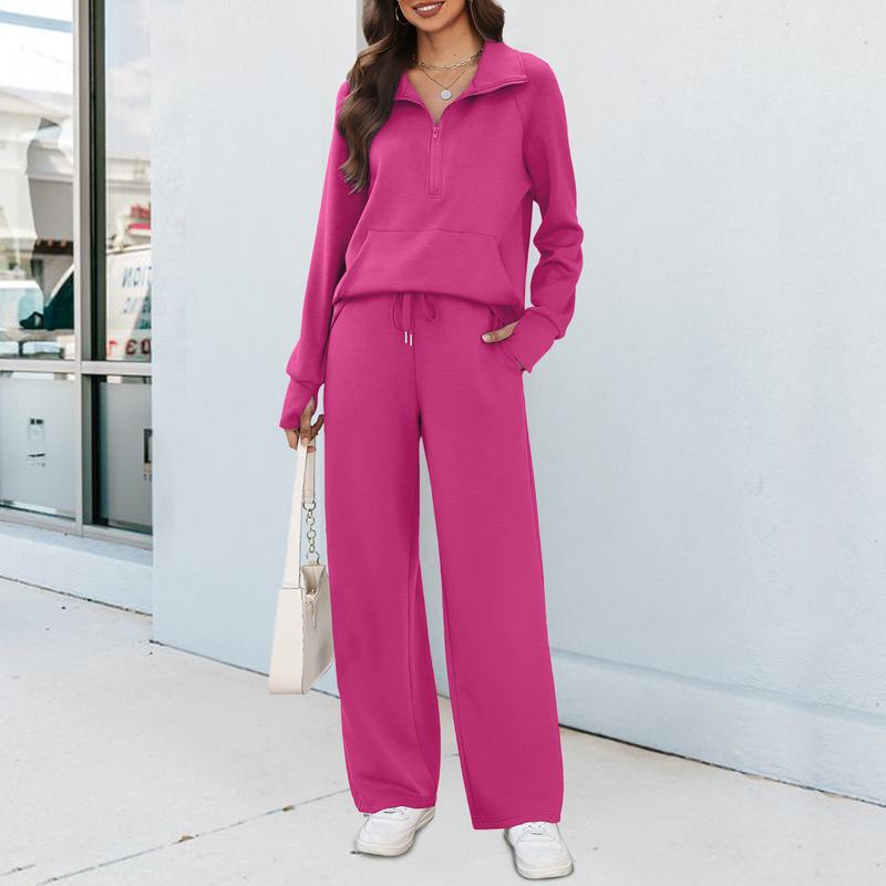 The lounge tracksuit includes a half-zip sweatshirt and high-waist wide-leg sweatpants. It has ribbed cuffs, a v-neck, drop shoulder, long sleeves with thumbholes, and spacious pockets. This creates an oversized style and chic look.