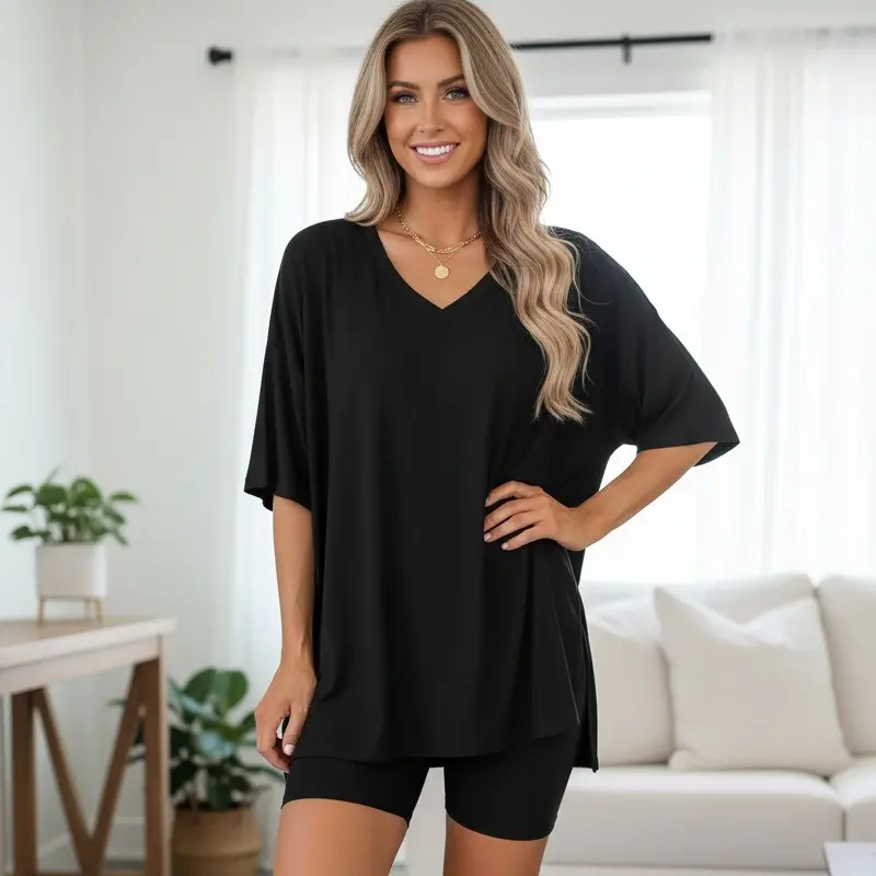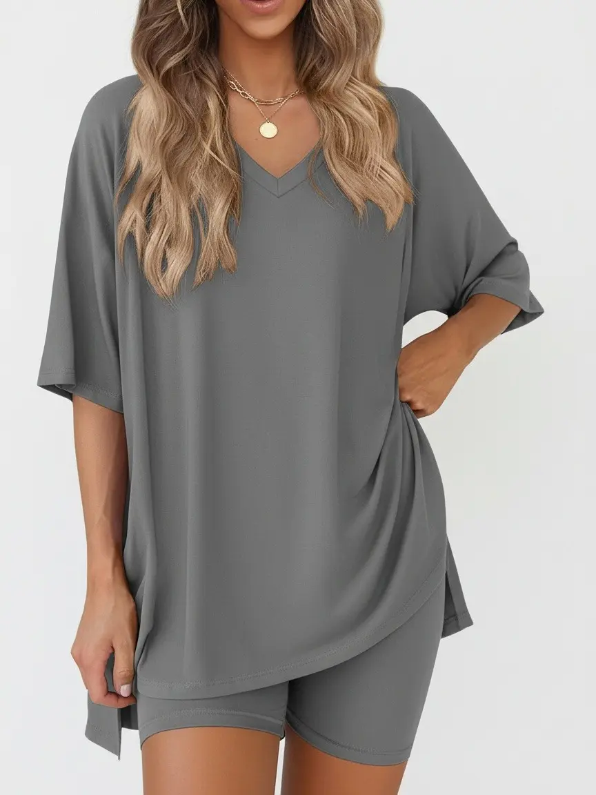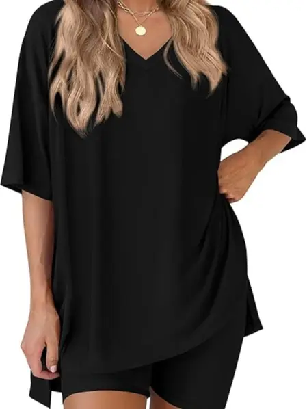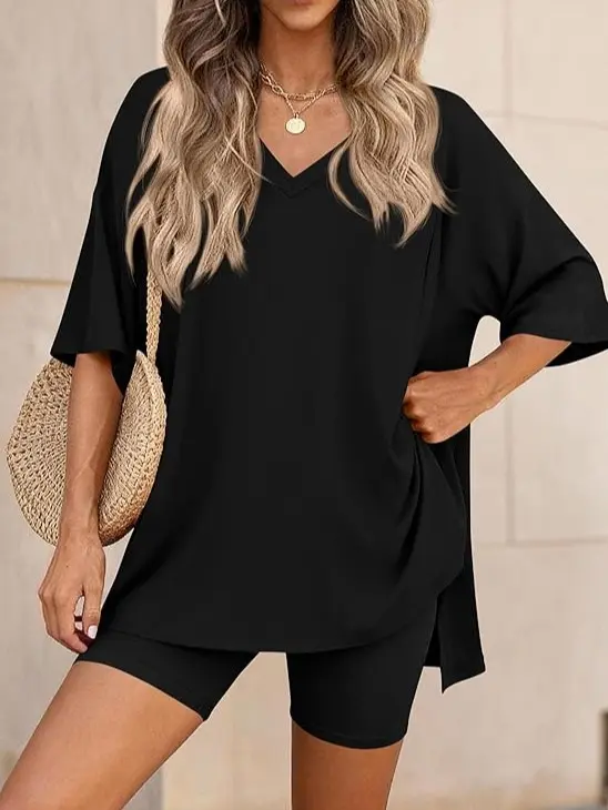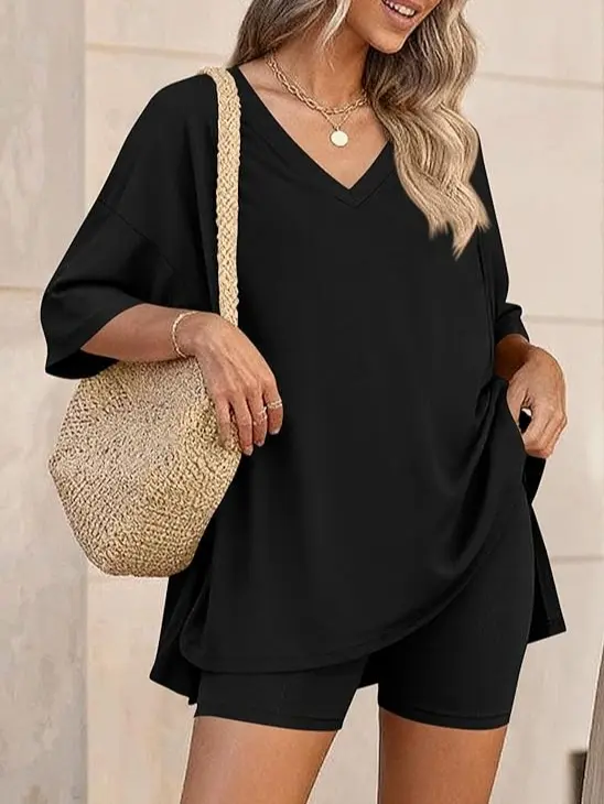 ·Design: 2 Piece Summer Short Sets, short sleeve top with V-neck and side slits, matching with high waist elastic bodycon biker shorts for a perfect fit and easy movement