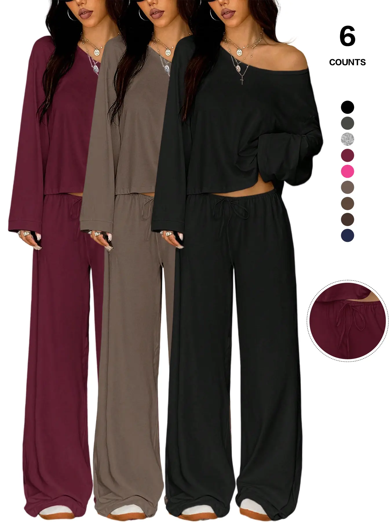 Women's 2 Piece Matching Lounge Set Off The Shoulder Long Sleeve Top and Drawstring Wide Leg Pants Casual Sweatsuit