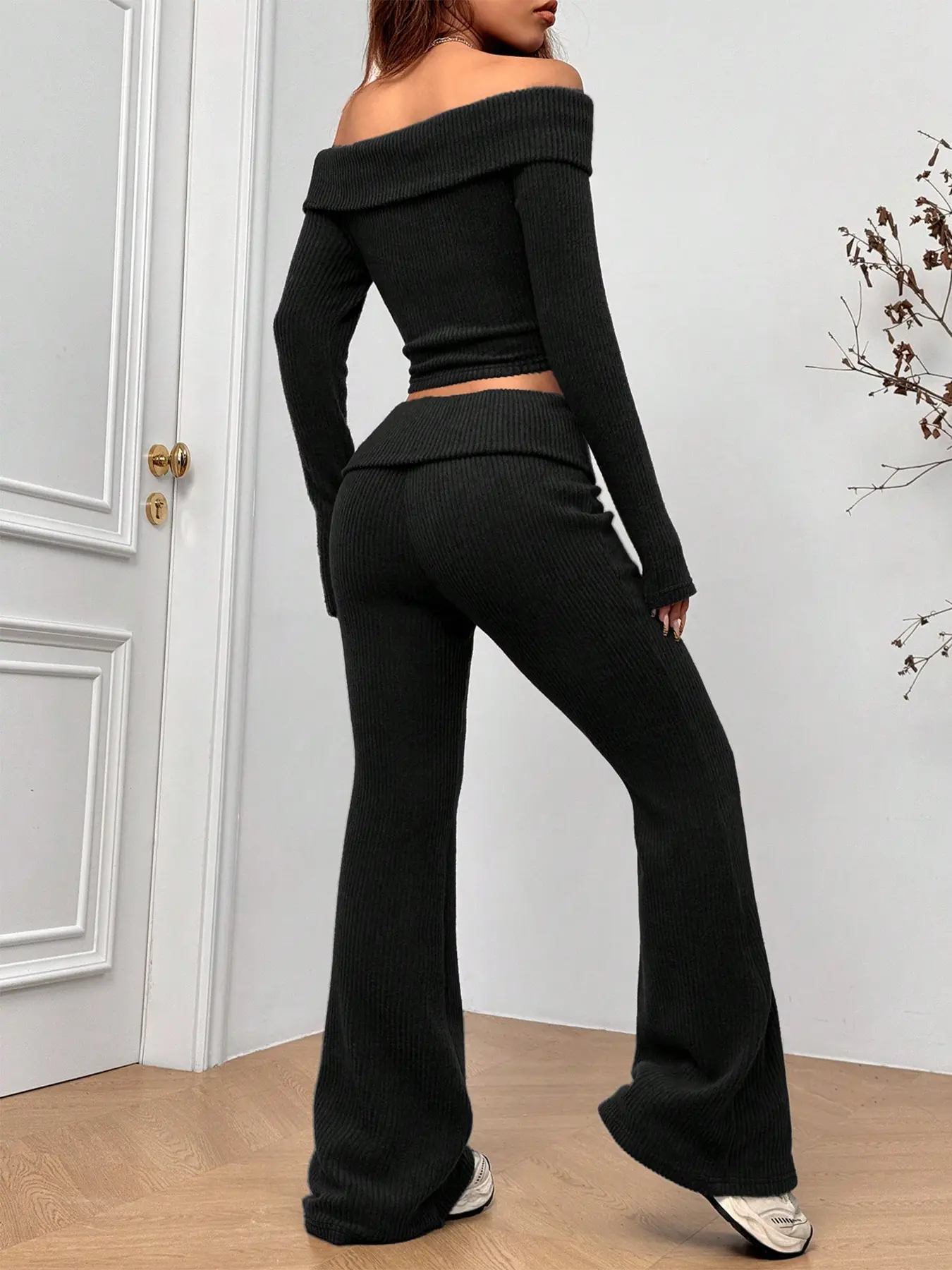 5. 2026 Women's 2-Piece Matching Set, Off-The-Shoulder Long Sleeve Crop Top & High-Waist Flare Leg Pants, Sexy Y2K Ribbed Knit