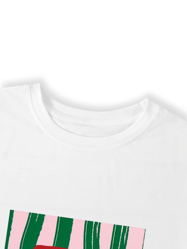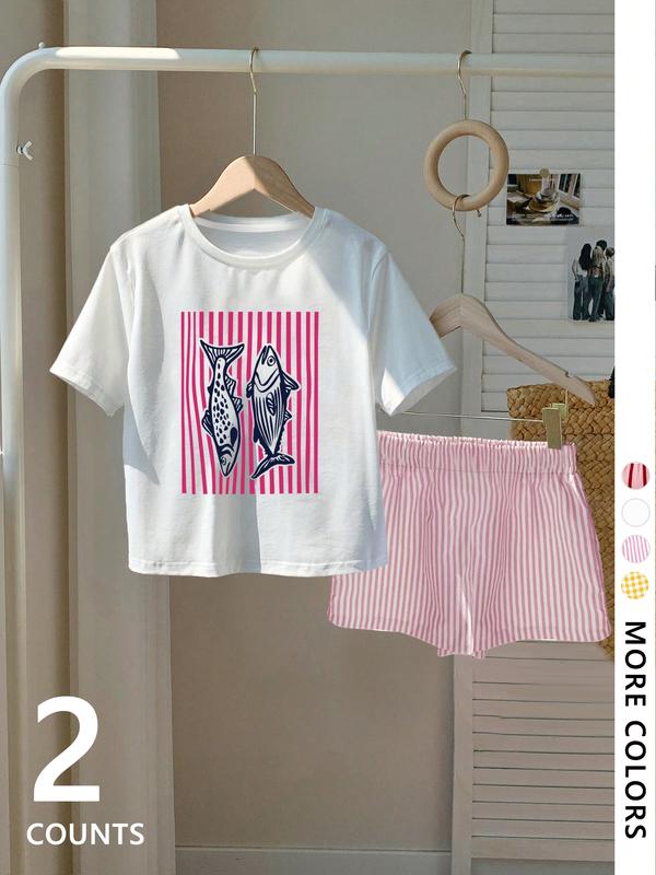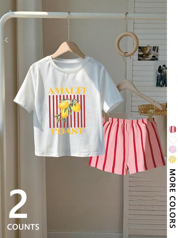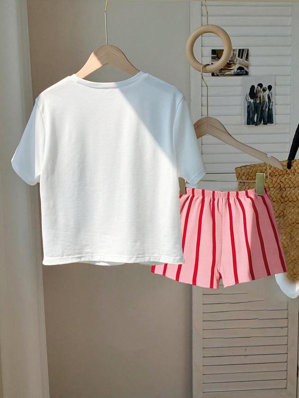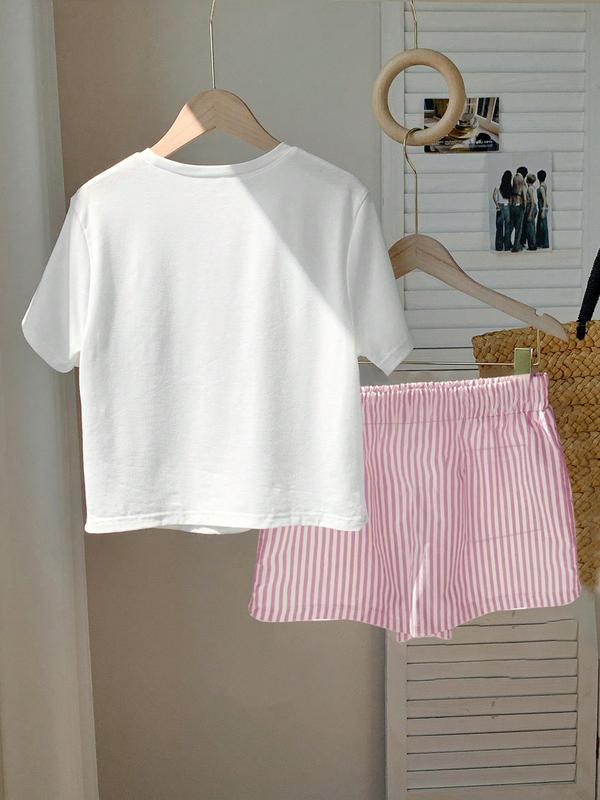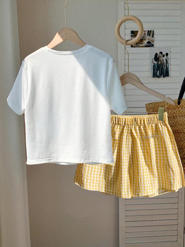 2 Piece Women's T-Shirt with Bow Letter Print, Casual Elastic Waist Plaid Loose Shorts Set for Retro and Sporty Styles