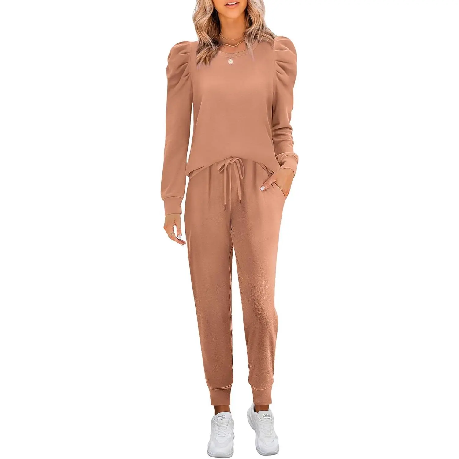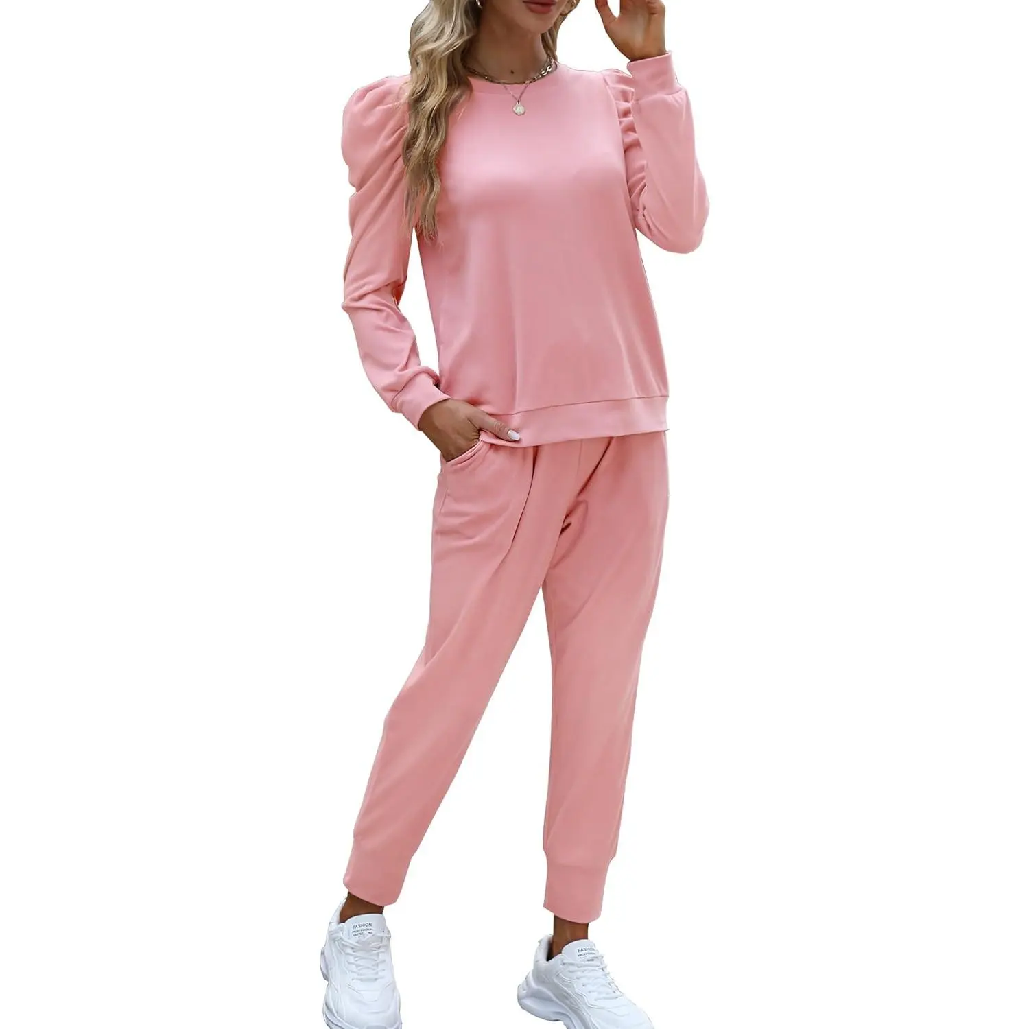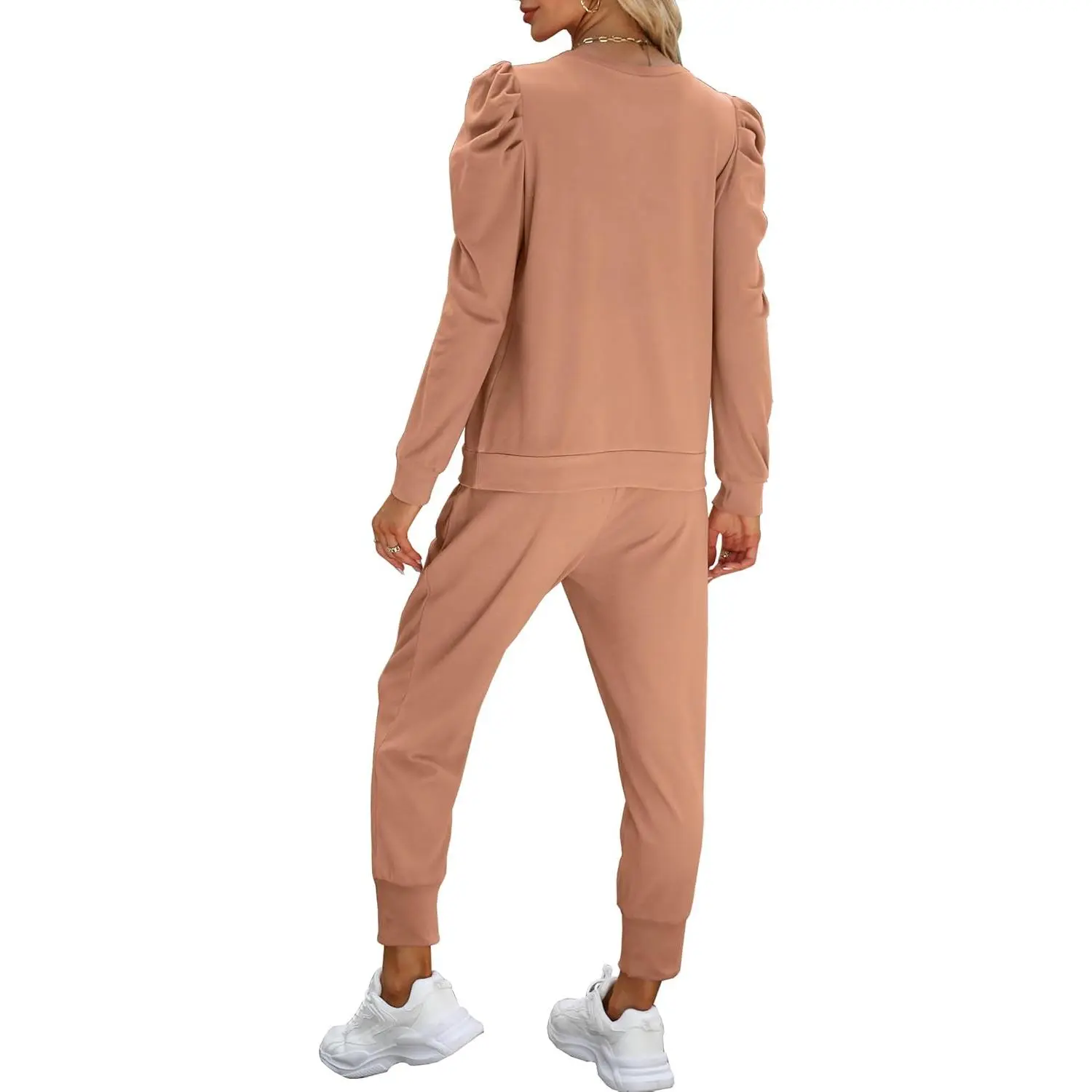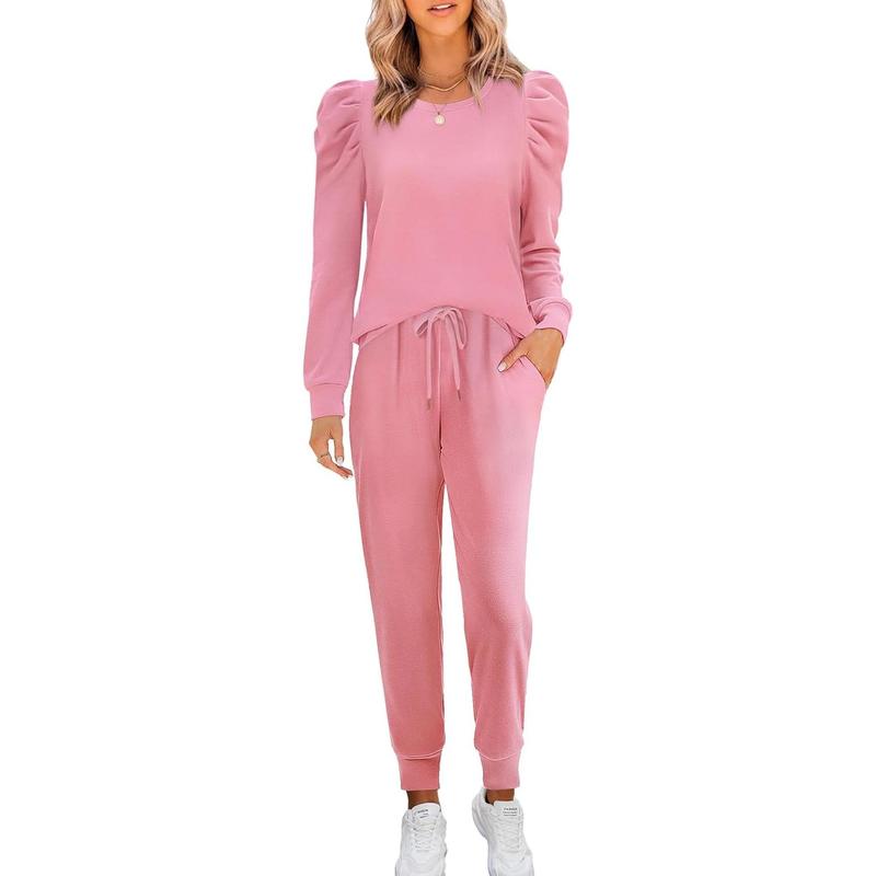 Womens Cute Puff Sleeve Casual Sweatsuit 2 Piece Outfits