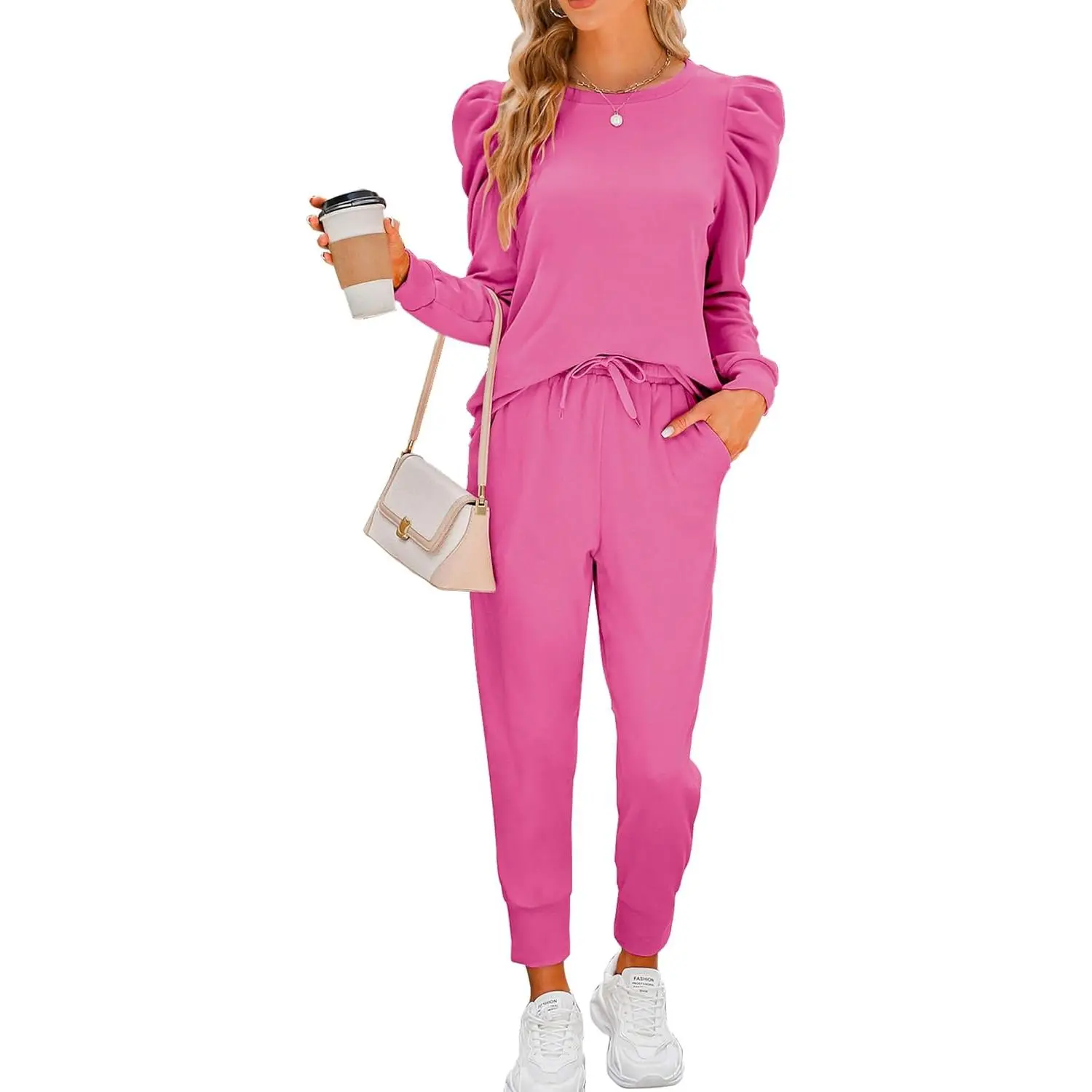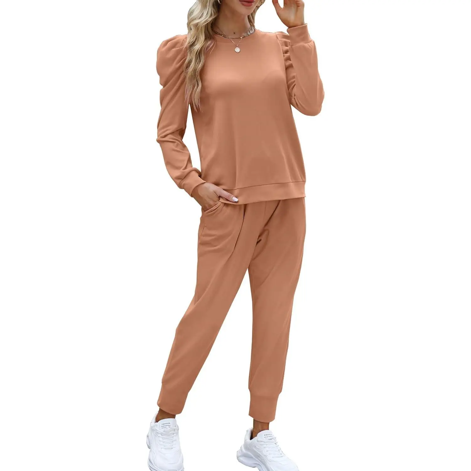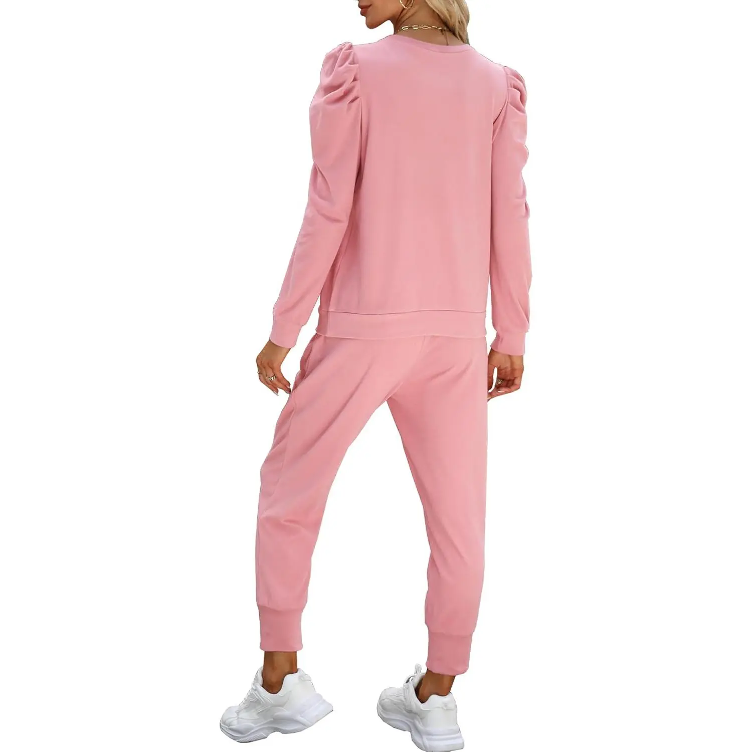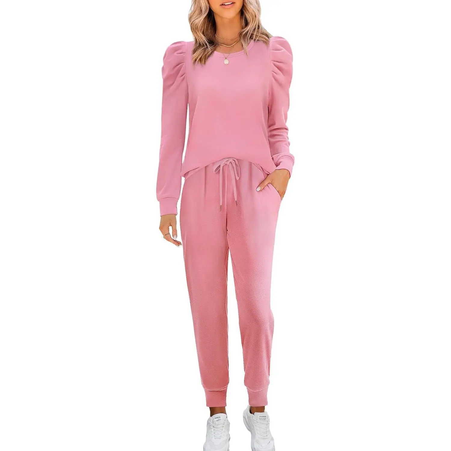 Womens Cute Puff Sleeve Casual Sweatsuit 2 Piece Outfits