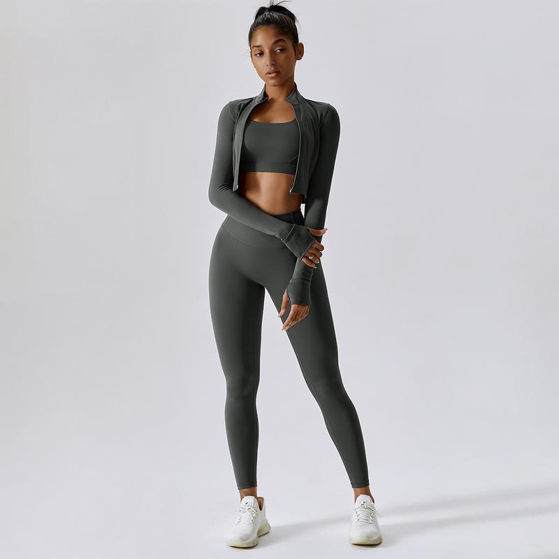 ·The set includes a zip-up crop jacket, adding versatility to your outfit.