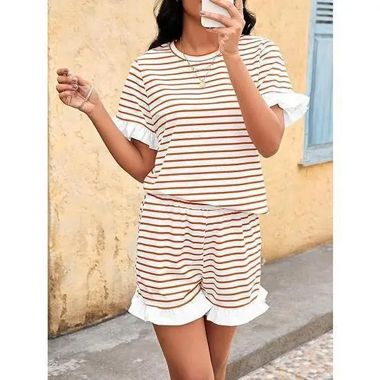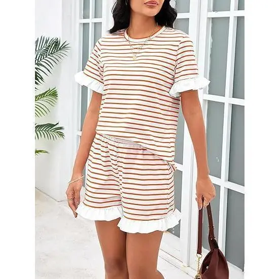 ·Ruffle Trim: This 2 piece set features chic, eye-catching stripes and a ruffle trim on tops and shorts, designed to flatter your silhouette. Blend of comfort and style for a confident look