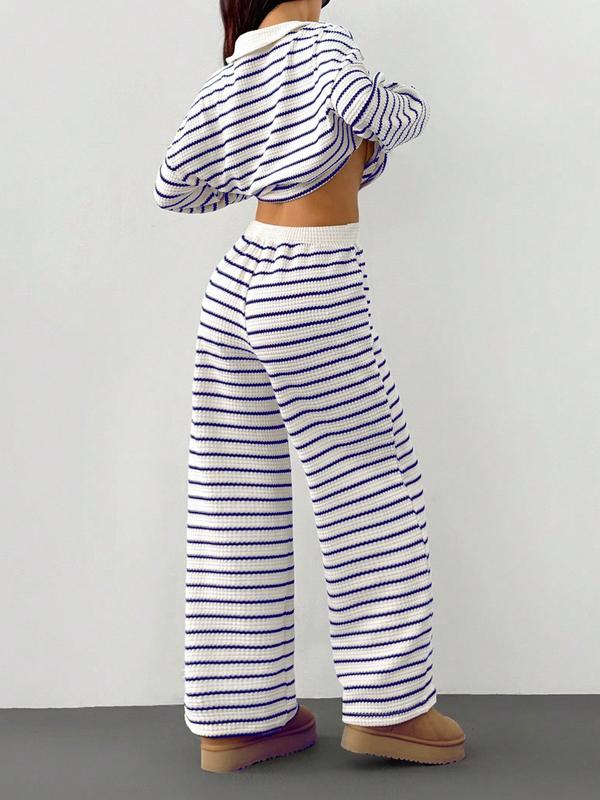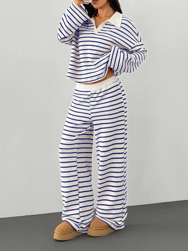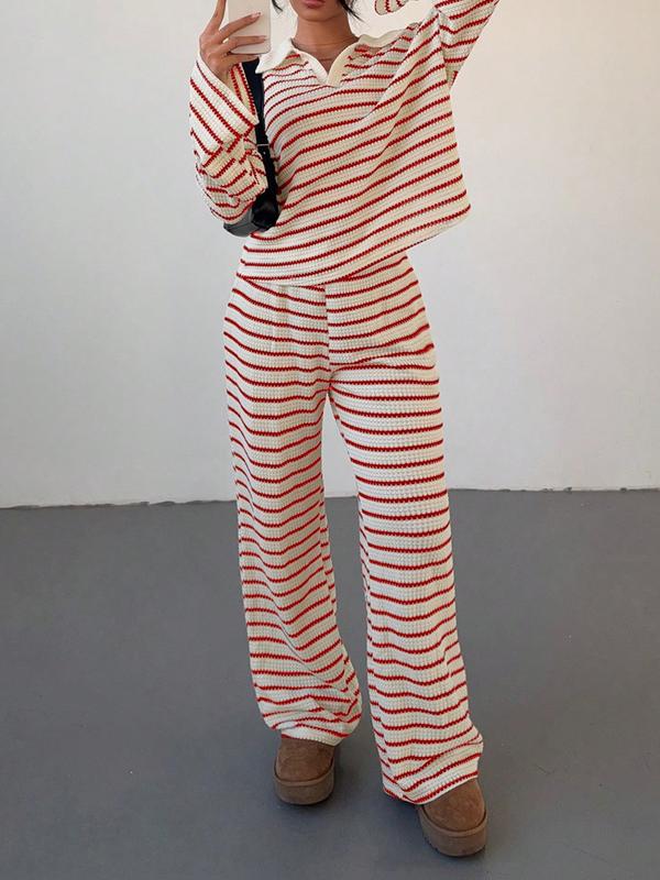 2-piece women's loose striped V-neck dropped shoulder long-sleeved T-shirt and elastic waist striped pants autumn and winter knitted suit